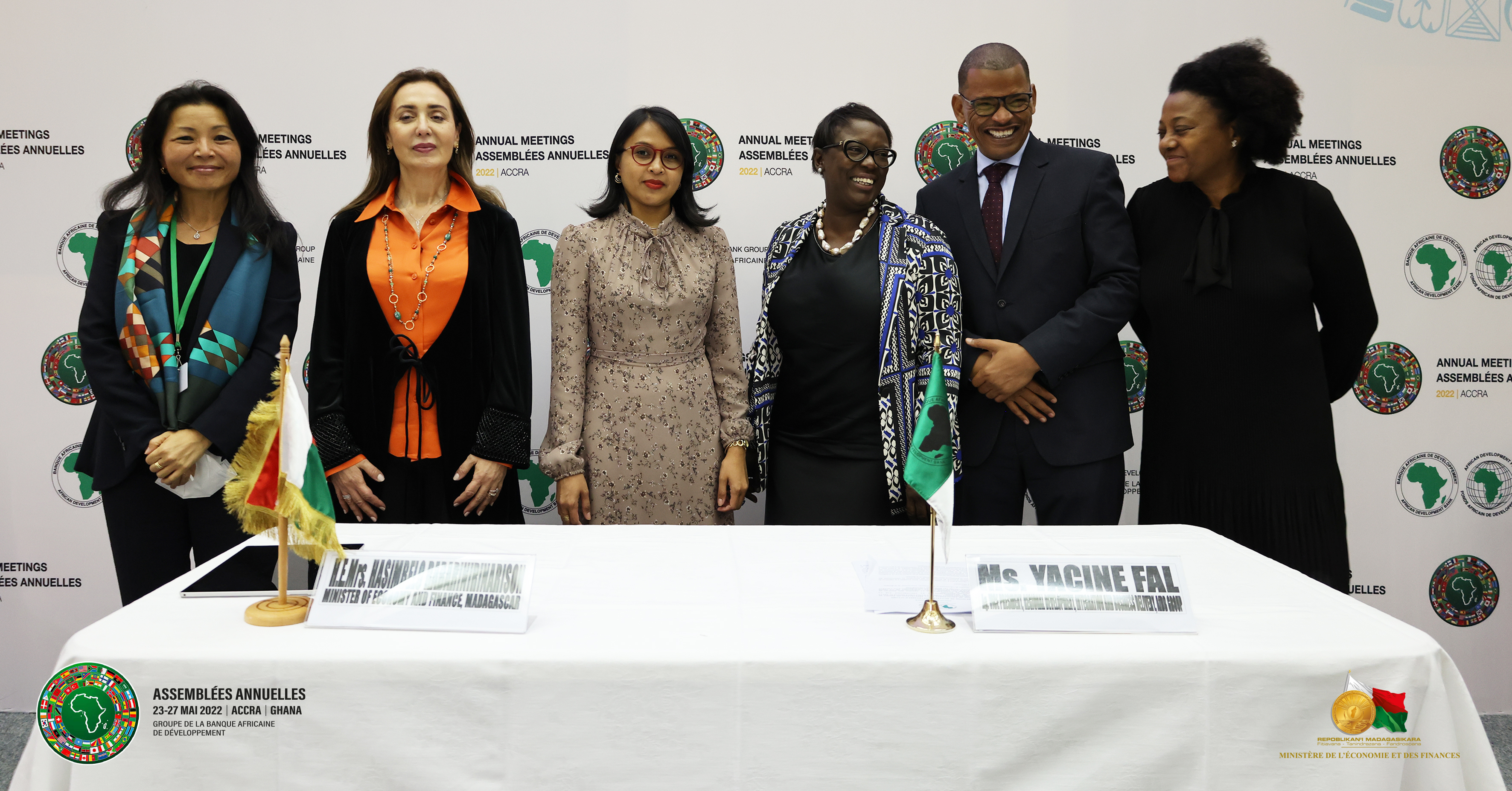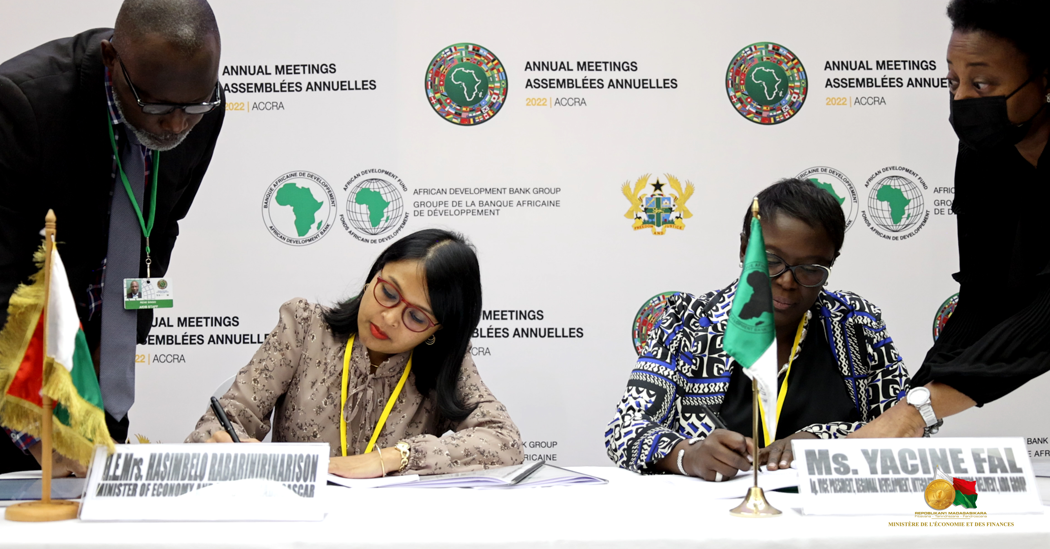 Accra, 23 Mai 2022 En marge des 57èmes Assemblées annuelles du Groupe de la Banque Africaine de Développement, une cérémonie de signature de 3 accords de financement s’est déroulée à Accra, la capitale Ghanéenne, le 23 Mai 2022 entre Madagascar et la BAD, respectivement représentés par la Ministre malgache de l’Economie et des Finances, Rindra Hasimbelo RABARINIRINARISON et la Vice-Présidente chargée du développement régional de la Banque, Yacine FAL.