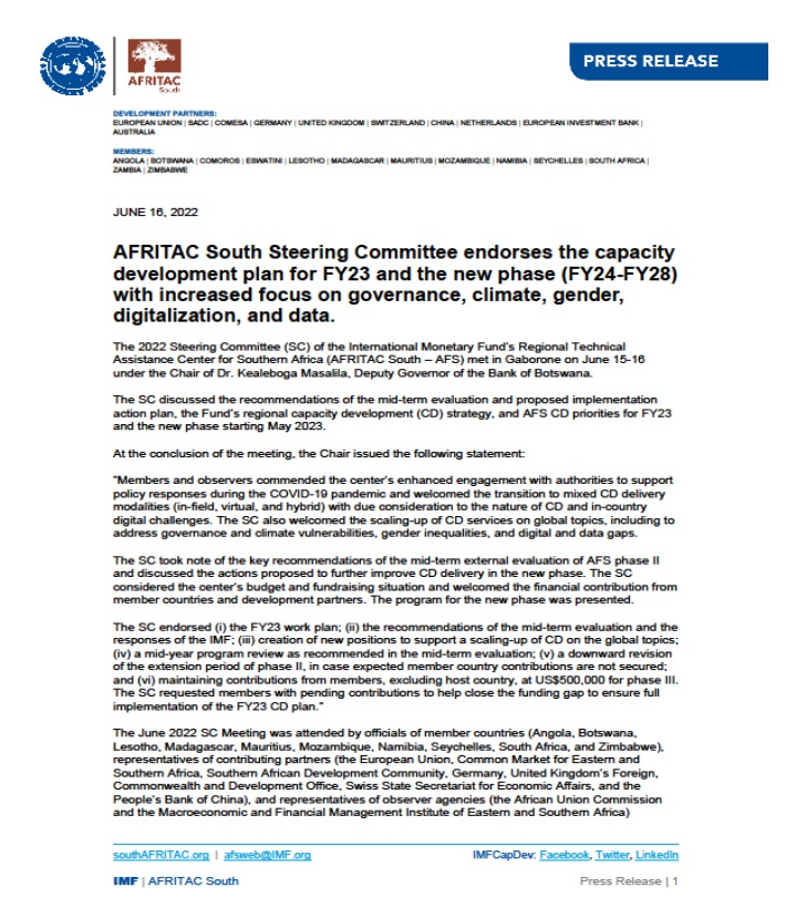 Le Comité d’Orientation de l'AFRITAC Sud entérine le plan de renforcement de capacité des pays membres pour l’année 2023 et adopte la programmation pour la nouvelle phase 2024-2028 avec un accent accru sur la gouvernance, le climat, le genre et la numérisation. Une réunion du Comité d’Orientation ou « Steering Committee Meeting » de l’AFRITAC Sud, Centre de développement de capacités instauré grâce à un partenariat multilatéral avec le Fonds Monétaire International (FMI) dont Madagascar fait partie, s’est tenue à Botswana, Gaborone les 15 et 16 Juin 2022 derniers suite à l’invitation du Directeur de l’Institut de Formation pour l’Afrique (FMI) Monsieur Abdoul Aziz Wane. Madagascar y a été représenté par Madame ABRAHAM Lantoniaina Félicité, Directeur de la Coordination et du Suivi des Réformes auprès du Ministère de l’Economie et des Finances et par Madame RASAMOELISON Miora, Responsable de l’Institut du Banky Foiben’i Madagasikara. Ont été discutés lors de la réunion (i) les résultats et les recommandations de l’évaluation à mi-parcours des activités, (ii) la stratégie de renforcement de capacités régionales du Fonds et les priorités pour l’exercice budgétaire 2023 et la période 2024-2028, ainsi que (iii) le budget et les ressources de l’organisation. Voir ci-dessous les détails dans le PRESS RELEASE –AFRITAC South June 2022 Steering Committee Meeting