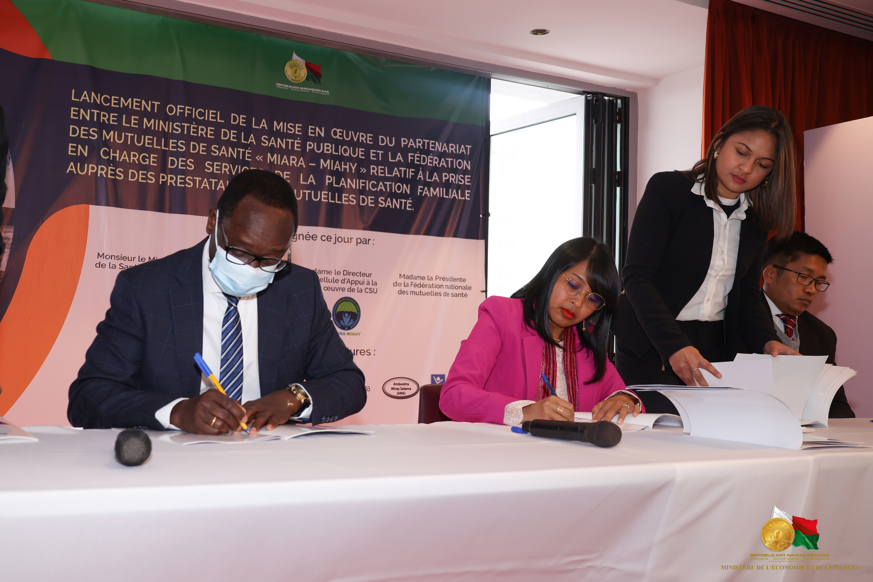 Le lancement officiel de la mise en œuvre du partenariat entre le Ministère de la Santé Publique et de la fédération des mutuelles de santé « Miara-Miahy » relatif à la prise en charge des services de la planification familiale auprès des prestataires des mutuelles de santé s’est tenu aujourd’hui 26 Septembre à Ivandry En septembre 2021, SEM le Président de la République, Andry RAJOELINA et les décideurs nationaux ont renforcé leur engagement pour augmenter la prévalence contraceptive à 60% vers la fin de 2023 et les ressources domestiques allouées à l’acquisition des produits de la Planification Familiale à travers la mobilisation de crédits correspondant à 5% des besoins nationaux.