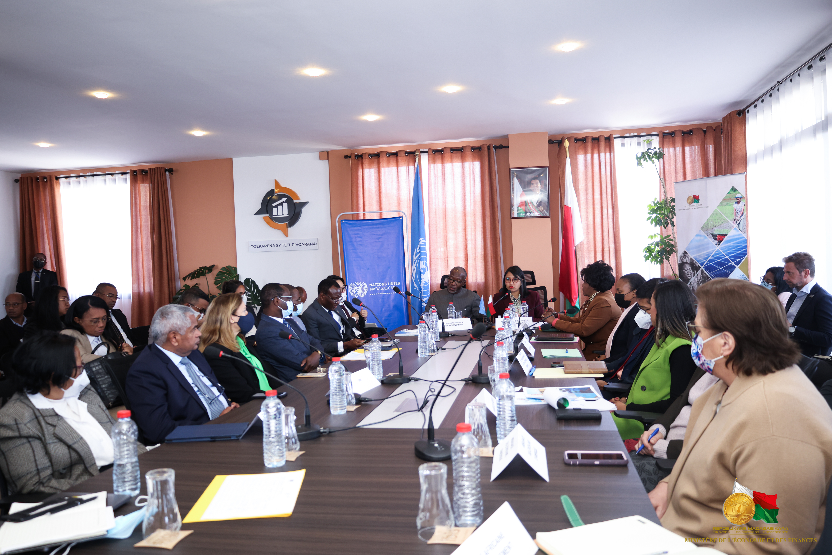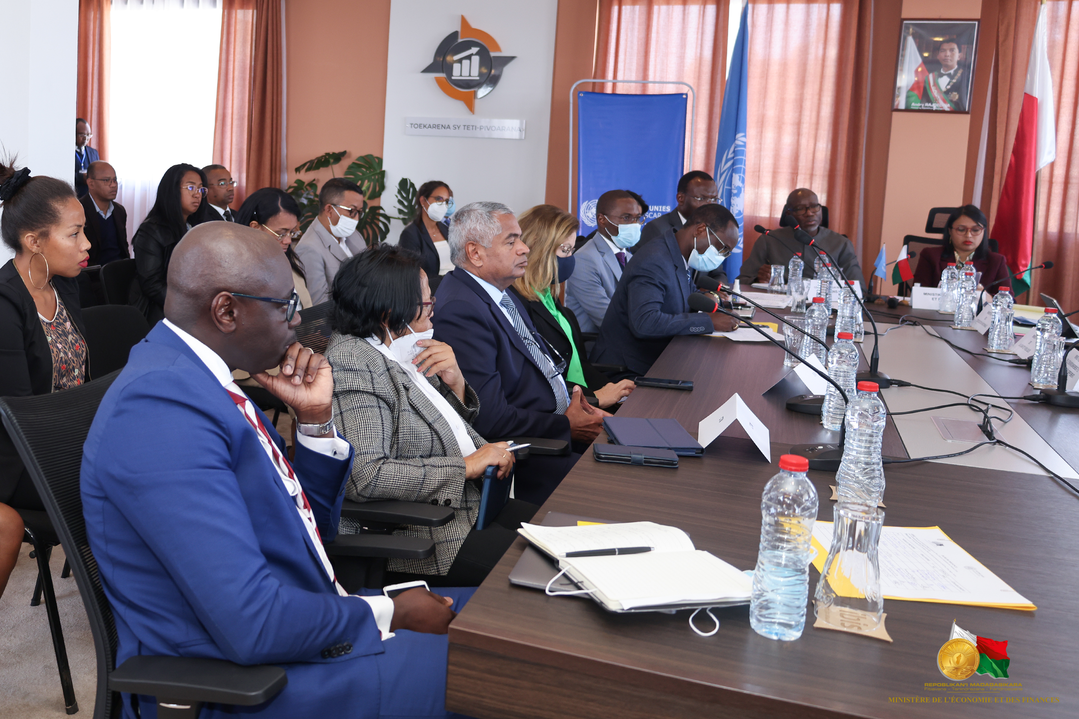 La Première réunion du Comité de Pilotage Conjoint du Plan- Cadre de coopération des Nations- Unies pour le développement durable (UNSDCF 2021-2023) s’est tenue ce jour à l’immeuble Plan Anosy en présence des deux présidents du Comité de pilotage : le Ministre de l’Economie et des Finances et le Coordonnateur Résident du Système des Nations Unies, et de quelques membres du Gouvernement et également présidents des axes stratégies, ainsi que les Partenaires Techniques et Financiers, la Société Civile et le Secteur privé. Durant cette réunion, les membres du Comité ont pu discuter des progrès réalisés qui sont déjà palpables, mais aussi des contraintes et problèmes rencontrés dans la mise en œuvre et des opportunités émergentes pour la programmation de l’UNSDCF. Des recommandations ont été également évoquées pour renforcer la mise en œuvre des activités.