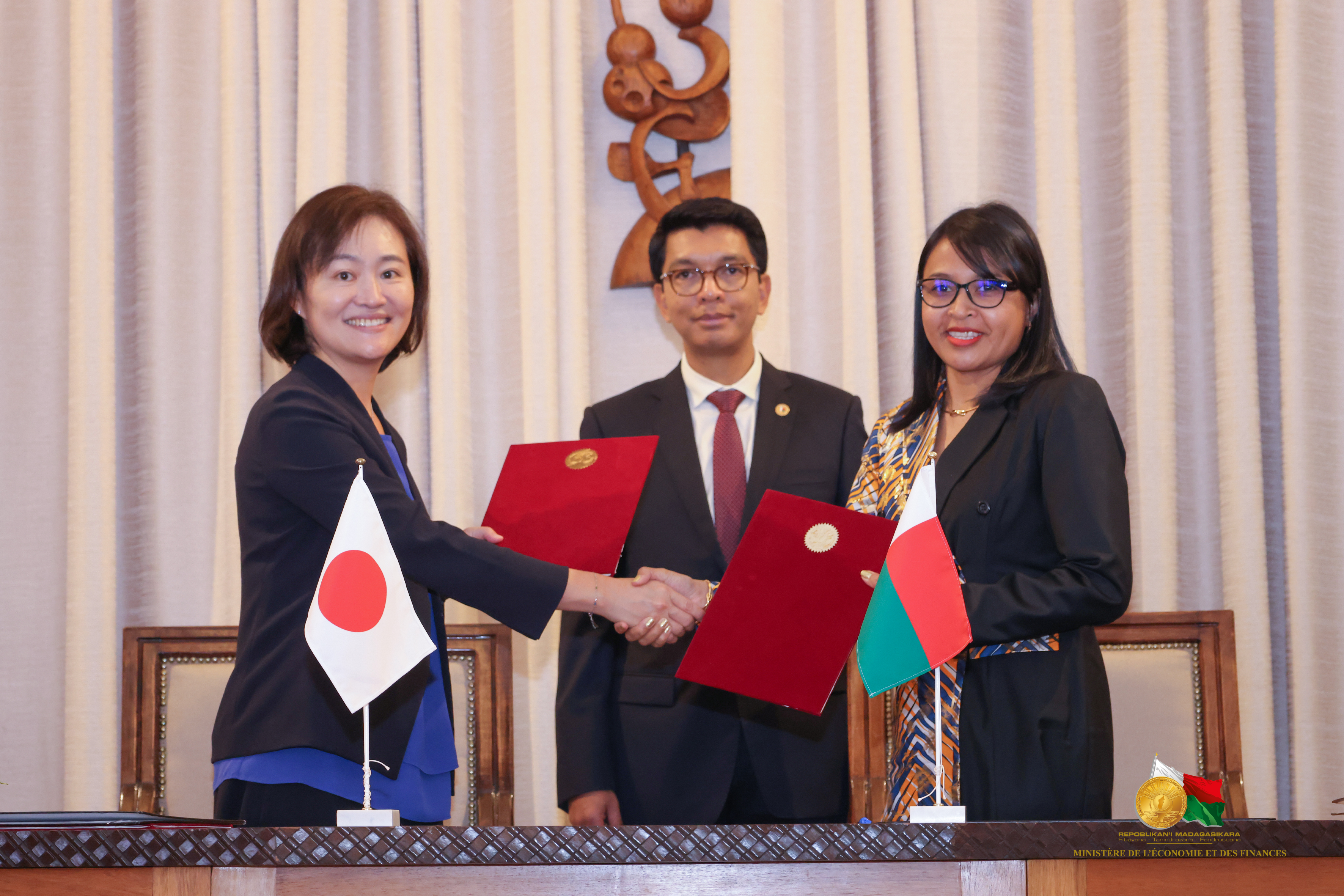 Les gouvernements de Japon et de Madagascar, respectivement représentés par Madame le Représentant de la JICA à Madagascar et Madame le Ministre de l'Economie et des Finances, ont procédé aujourd'hui, à Iavoloha, à la cérémonie de signature d'un accord de don d'une valeur de 15.258.508,77 USD en présence du Président de la République, Monsieur Andry RAJOELINA. Ce projet marque l'engagement du Japon dans sa contribution au développement de Madagascar, notamment dans son objectif de développer la filière rizicole et de devenir, à terme, autosuffisant en alimentation, voire même devenir le grenier en matière de riz dans la Zone Océan Indien. Des objectifs d'ailleurs stipulés dans le Programme Émergence Madagascar (PEM) dans le Velirano numéro 9.
