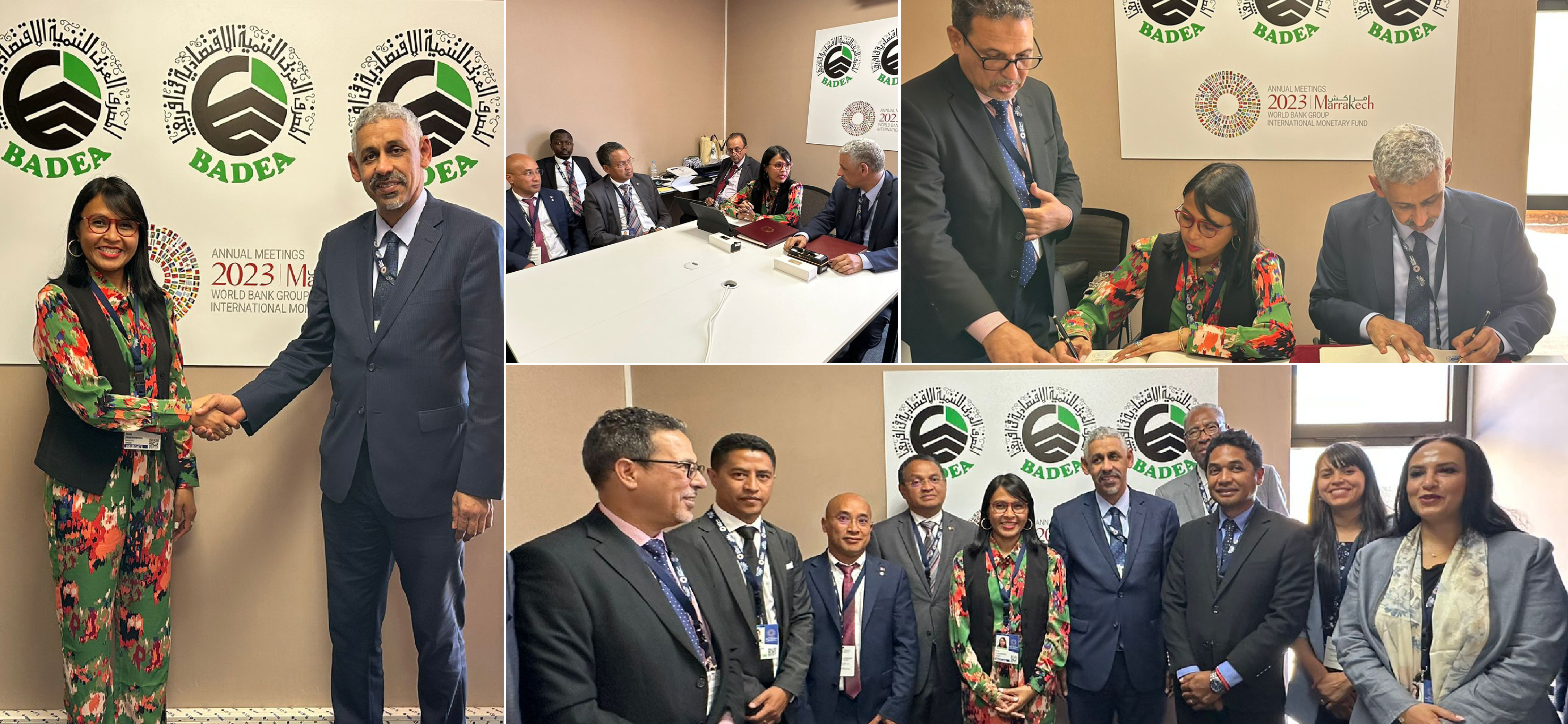 En marge des Assemblées Annuelles du groupe de la Banque Mondiale et du FMI au Maroc, le Ministre de l'Economie et des Finances, Madame Rindra Hasimbelo RABARINIRINARISON et le Président de la Banque Arabe pour le Développement en Afrique (BADEA), Dr Sidi Ould Tah ont procédé hier, 11 octobre 2023, à la signature de l'accord de financement relatif au projet de construction de Fly Over d'un montant de 31,5 millions USD dont 28 millions un prêt de la BADEA repartit en 2 tranches et les 3,5 millions restant une contrepartie venant de la partie malagasy.