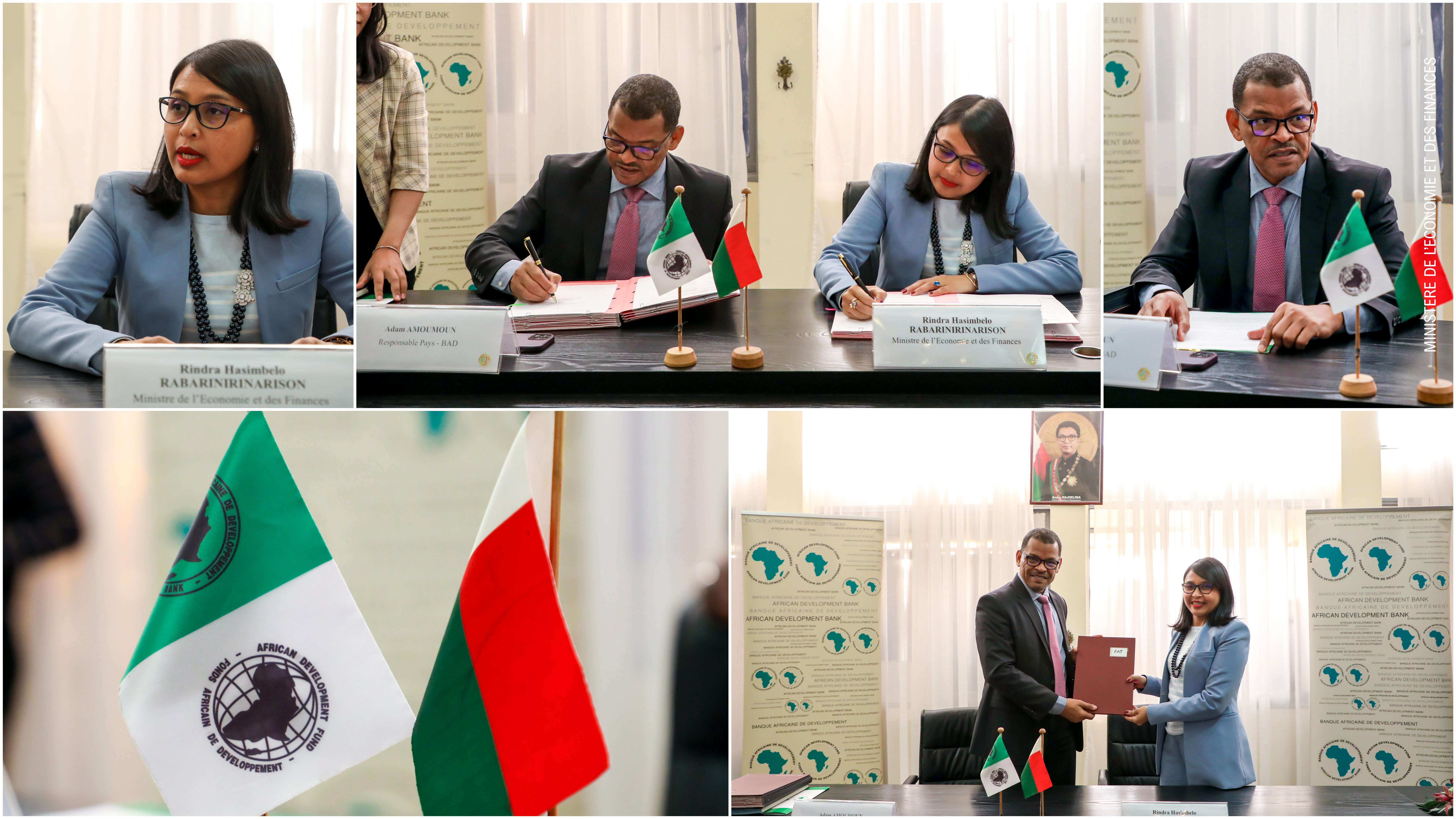 Le Gouvernement Malagasy, représenté par le Ministre de l’Economie et des Finances (MEF), Madame Rindra Hasimbelo RABARINIRINARISON et le Représentant-pays de la Banque Africaine pour le Développement (BAD) à Madagascar, Monsieur Adam AMOUMOUN ont procédé à la signature d’un accord de financement d’un montant de 50 millions d’Unités de Compte (UC), ce jour.