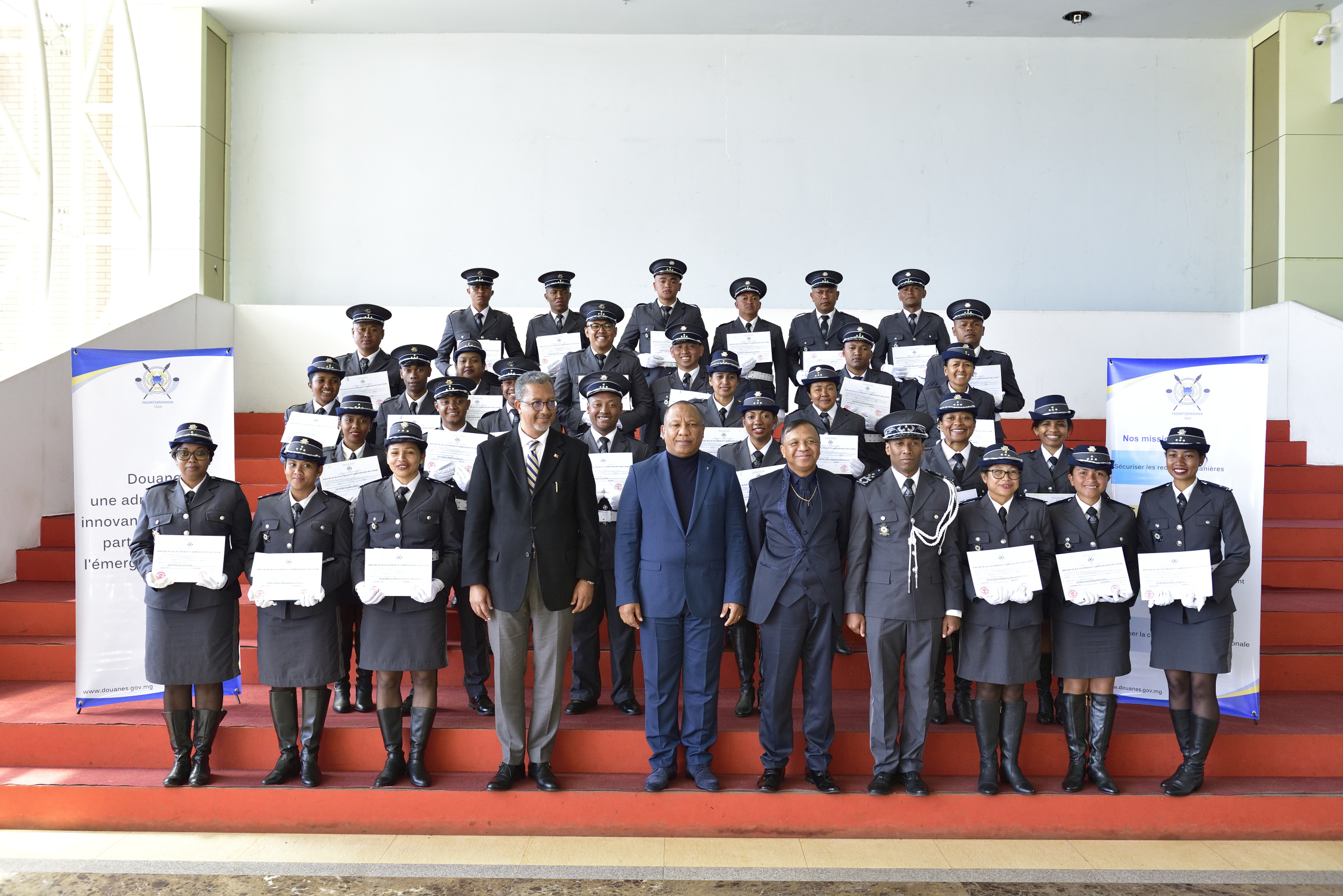 Antananarivo, le 09 août 2019. Désormais, ils sont Inspecteurs des Douanes. Ils, ce sont les 30 Elèves Inspecteurs des Douanes de la promotion FANEVA, la cinquième promotion qui ont reçu ce jour leurs diplômes et en se sont vus remettre leurs insignes de grade. Ils viennent rejoindre les rangs des 146 Inspecteurs des Douanes déjà en service dans l’Administration douanière Malgache. Ils vont œuvrer pour une administration innovante, redevable, partenaire pour l’émergence du pays. Sous le haut patronage de Monsieur le Ministre de l’Economie et des Finances, la Direction Générale des Douanes a procédé ce jour, à leur sortie officielle au Centre de Conférence International (CCI) Ivato. Une promotion qui est parrainée par Monsieur NTSAY Christian, Premier Ministre, Chef du Gouvernement. Ces élèves inspecteurs ont été recrutés sur concours direct et professionnel suivant l’Arrêté n°10260.2016 MINFOP – MFB du 26 avril 2016 portant ouverture d’un concours direct et d’un concours professionnel pour le recrutement de cent (30) inspecteurs des douanes.