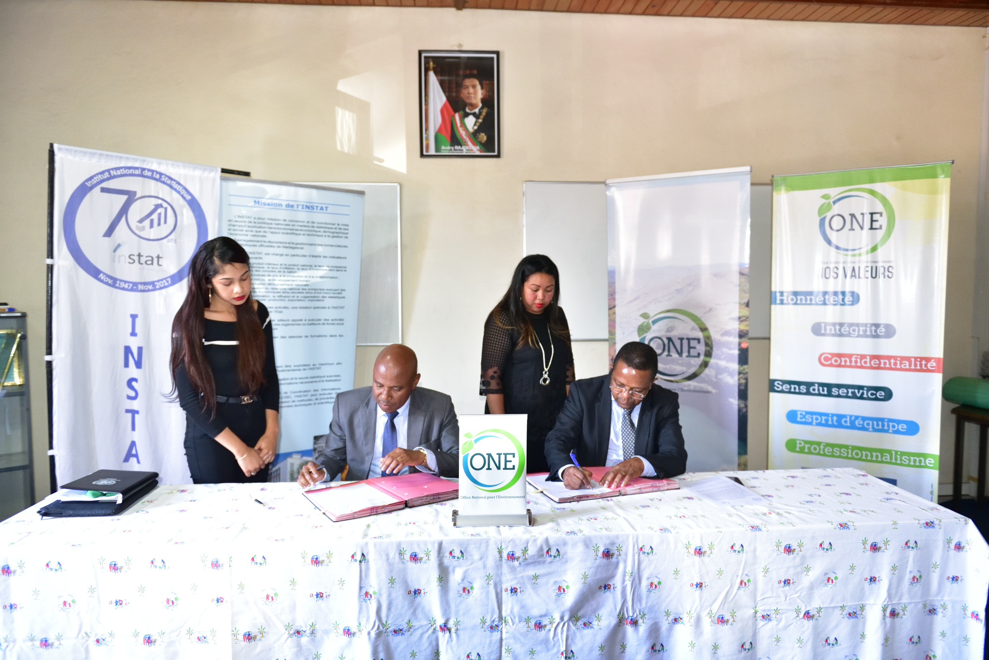 Antananarivo, le 10 octobre 2019. L’Institut National de la Statistique de Madagascar (INSTAT), organisme assurant la gestion de l’ensemble des données statistiques officielles, et l’Office National de l’Environnement (ONE), institution nationale en charge de la gestion du système d’information environnementale, signent une convention de collaboration pour une durée de 3 ans renouvelable. Elle consiste en un partage de données en vue de la mise à jour continue du Tableau de Bord Environnemental (TBE). Dans le cadre de cette collaboration, L’INSTAT s’engage, entre autres, à apporter son appui à l’ONE, dans l’amélioration de ses fiches descriptives des indicateurs. Il lui revient également d’assurer l’accompagnement de l’ONE dans le processus de validation de la méthodologie utilisée pour la collecte des données et pour l’élaboration des indicateurs officiels dans le domaine de l’environnement. L’ONE, pour sa part, s’engage à apporter toutes les informations nécessaires qui vont appuyer la formulation de ces indicateurs destinés aux TBE. Toutes les données dans le cadre de ce partenariat seront intégrées dans le système d’information environnementale et serviront ainsi à alimenter les TBE. Des données et informations fiables émanant d’institution crédible. C’est ainsi que M. AMPILAHY Laurent, Directeur Général de l’ONE, s’est exprimé pour qualifier les résultats attendus de ce partenariat. Un partenariat qui contribuera à la mise à jour des indicateurs du TBE relatifs à la situation socio-économique. Le Directeur Général de l’Instat, M. ROMALAHY Isaora Zefania, quant à lui, a souligné que cette collaboration va permettre une meilleure représentation du secteur environnement dans les Comptes Nationaux et contribuera ainsi, comme le stipule la convention, à améliorer les informations requises par les modèles macroéconomiques.