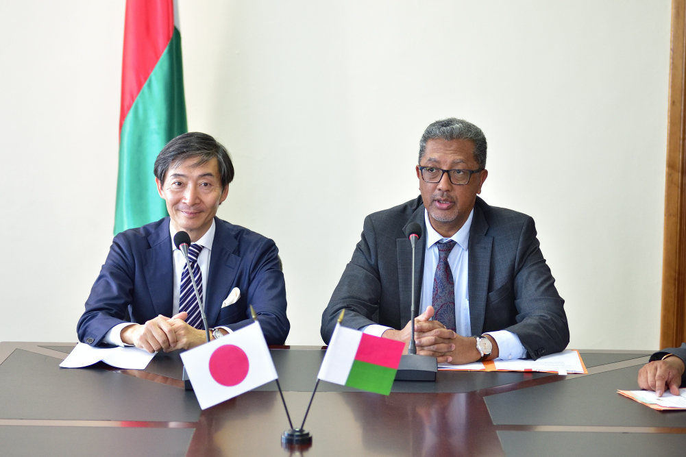 Antananarivo, le 14 novembre 2019. Une cérémonie de remise officielle du don japonais connu sous l’appellation « Kennedy Round I » ou Programme d’Assistance Alimentaire 2017 pour l’importation de riz s’est tenue ce jour dans les locaux du Ministère de l’Economie et des Finances à Antaninarenina. Pour l’événement, les parties Malagasy et Japonaise ont été représentées respectivement par Monsieur Richard RANDRIAMANDRATO, Ministre de l’Economie et des Finances de Madagascar et Son Excellence Monsieur Ichiro OGASAWARA, Ambassadeur du japon dans la Grande Île. Le Programme d’Assistance Alimentaire 2017 est la 24ème aide alimentaire que Madagascar a reçu du Japon. L’Echange de Notes le concernant a été signé entre les deux parties le 05 décembre 2017 pour un montant de 470 Millions de Yens destiné à l’achat de 6.700,96 TM de riz pour faire face à la pénurie ainsi qu’à la hausse du prix de cette denrée en période de soudure. Le riz est de qualité supérieure avec 5% de brisure. Une portion de 75% provient des Etats-Unis tandis que la quantité restante est importée de la Thaïlande. Suite aux appels à manifestation d’intérêts lancés au mois de Mars et Avril 2018 par l’Etat Malagasy, quatre opérateurs locaux ont été sélectionnés et chargés de la distribution du riz sur le territoire ainsi que du reversement de l’équivalent en Ariary de la valeur FOB de la marchandise. Par ailleurs, au moins deux tiers du prix FAB du riz en monnaie locale seront déposés dans un compte créé pour le fonds de contrevaleur pour des investissements à des fins de développement économique et social du pays. |