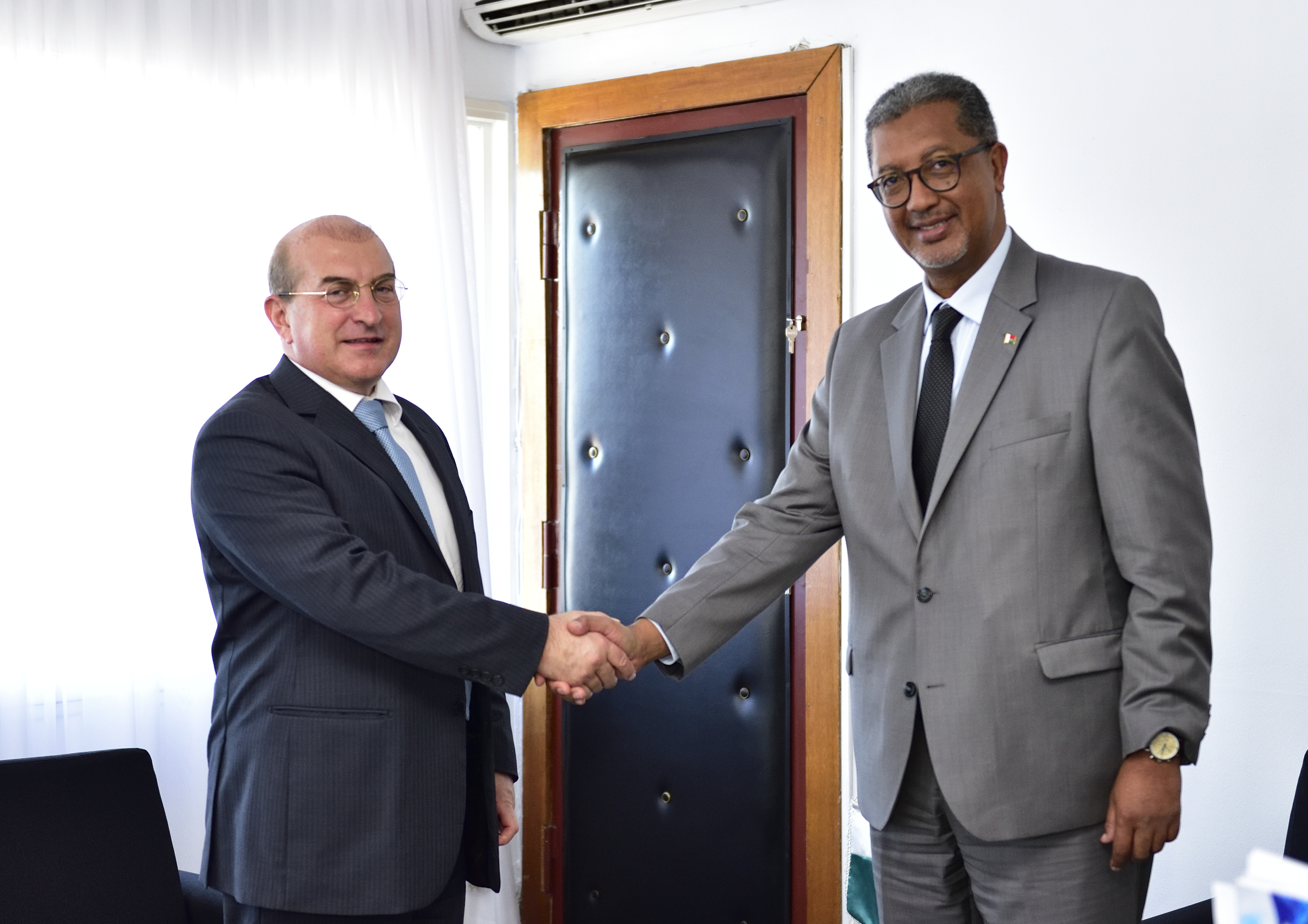 Le Grand Argentier reçoit SEM Giovanni Di GIROLAMOLe Ministre de l'Economie et des Finances, Monsieur RANDRIAMANDRATO Richard, a reçu ce 7 février 2019 dans son bureau à Antaninarenina l'Ambassadeur de l'Union Européenne , SEM Giovanni Di GIROLAMO et ses collaborateurs. |