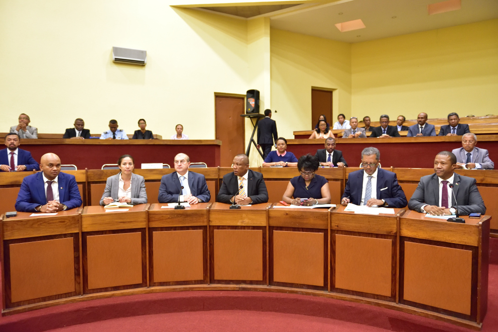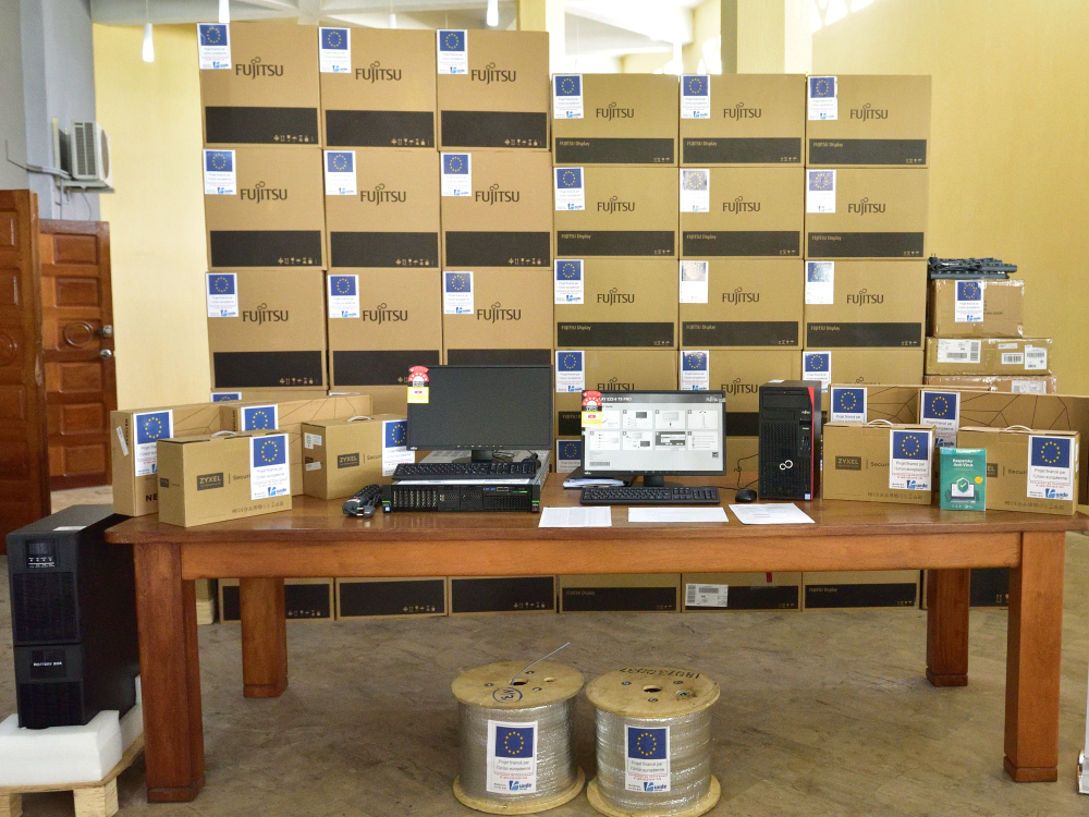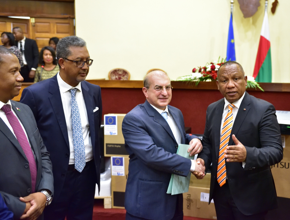 Antananarivo, le 16 janvier 2020. La cérémonie de réception des équipements informatiques et de réseau pour les Ministères utilisateurs de l’Application Unique de Gestion Uniforme des Ressources humaines de l’Etat (AUGURE) : 02 sites centraux (MEF, MTEFPLS) et 42 sites clients (20 ministères employeurs et 22 régions administratives) s’est tenue ce jour au Ministère des Affaires Etrangères sous le haut-patronage de Monsieur le Premier Ministre, Chef du Gouvernement et de Monsieur l’Ambassadeur de l’Union Européenne, en présence du Ministre de l'Economie et des Finances, de la Ministre du Travail, de l’Emploi, de la Fonction Publique et des Lois Sociales, du Président du Conseil d’Orientation et de Suivi du Programme de Réformes pour l’Efficacité de l’Administration (COS/PREA), des représentants des Ministères employeurs et du projet Ny Fanjakana ho an’ny Daholobe (NFD). L’Application Unique de Gestion Uniforme des Ressources humaines de l’Etat (AUGURE) a été initiée et co-gérée conjointement par le Ministère de l'Economie et des Finances et le Ministère du Travail, de l’Emploi, de la Fonction Publique et des Lois Sociales en 2017. L’AUGURE 2.0 ou AUGURE nouvelle version, telle que développée actuellement en application du Décret n°2019-1446 du 07 août 2019 portant institutionnalisation et opérationnalisation de l’AUGURE permettra d’informatiser la gestion des carrières et des compétences du personnel de l‘Etat. Cette nouvelle version assurera à terme une gestion en temps réel des ressources humaines de l’Etat, en fournissant des informations à jour, précises et fiables, sur la base de données des effectifs, gérée conjointement par les deux Ministères responsables de son opérationnalisation de l’AUGURE. Tel qu’il est stipulé dans le volet “Economie et Finances” de la Politique Générale de l’Etat, le système de contrôle des dépenses doit être renforcé pour que l’argent des contribuables soit utilisé à bon escient. A terme, ce logiciel offrira une vision exhaustive du personnel de l'Etat, de sa répartition, et de son alignement avec les priorités du gouvernement. C'est une étape incontournable pour avancer vers une fonction publique plus efficace contribuant ainsi à la lutte contre la corruption qui peut gangréner les recrutements, les progressions de carrière, les affectations ou encore le paiement de la solde. Les matériels remis comportent 78 postes de travail complets destinés aux ministères employeurs et services déconcentrés et 4 serveurs redondants destinés aux sites centraux du MEF et du MTEFPLS.