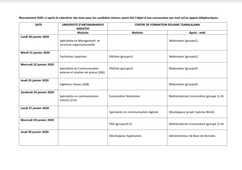 Après l'appel à Manifestation d'Intérêt lancé par la Direction Générale de la Douane au mois de décembre dernier, ci-après le calendrier des tests pour les candidats retenus ayant fait l’objet d'une convocation par mail et/ou appels téléphoniques.