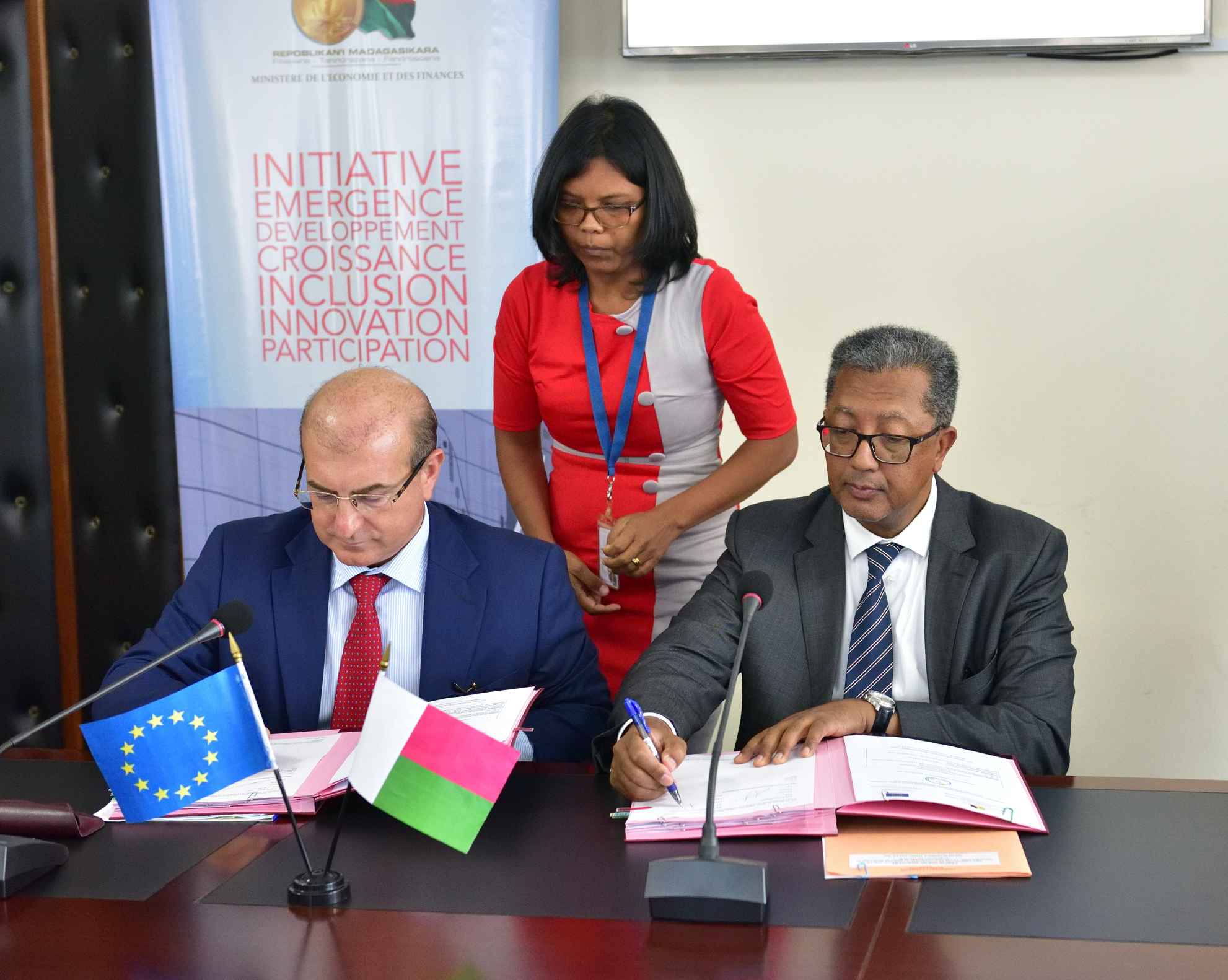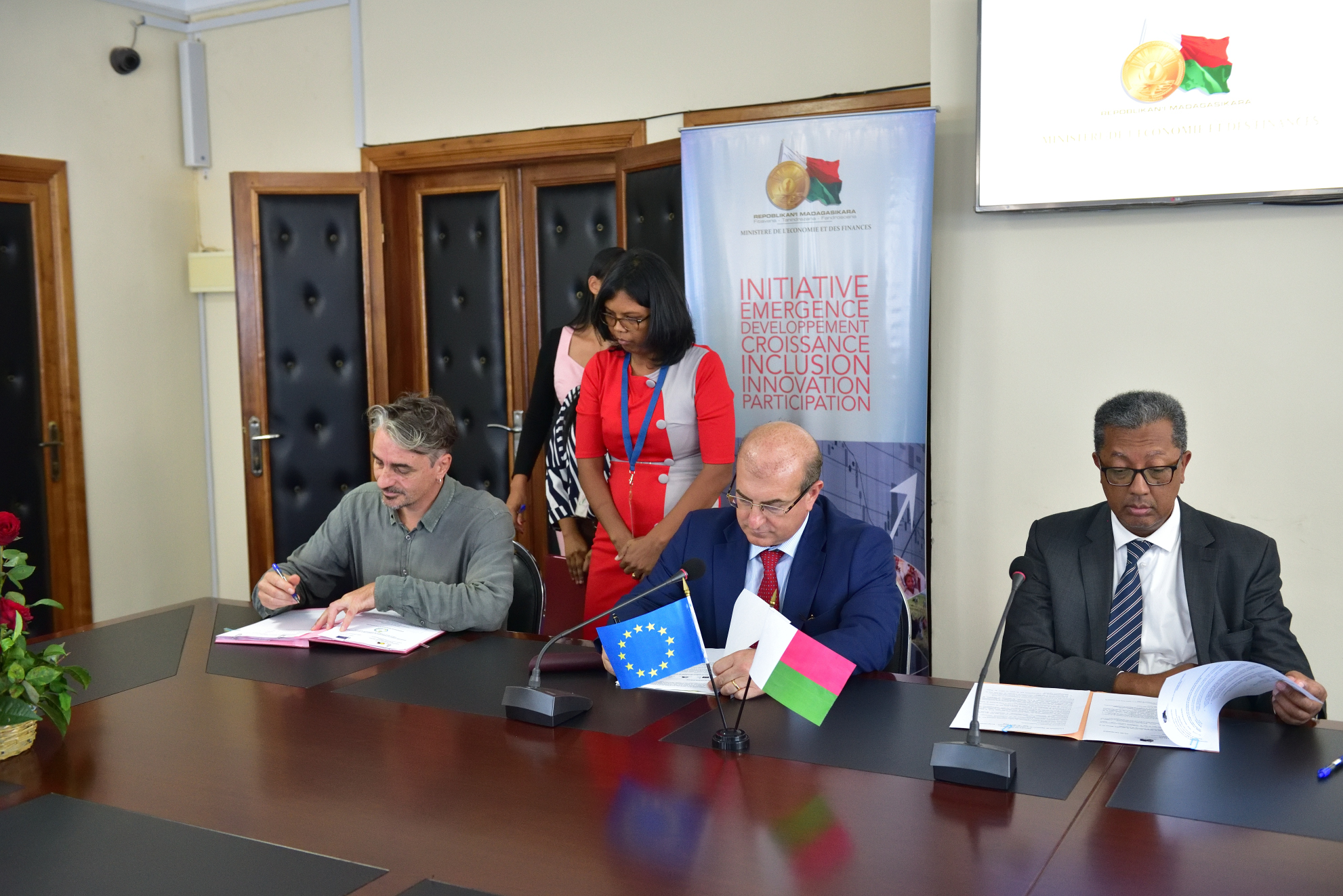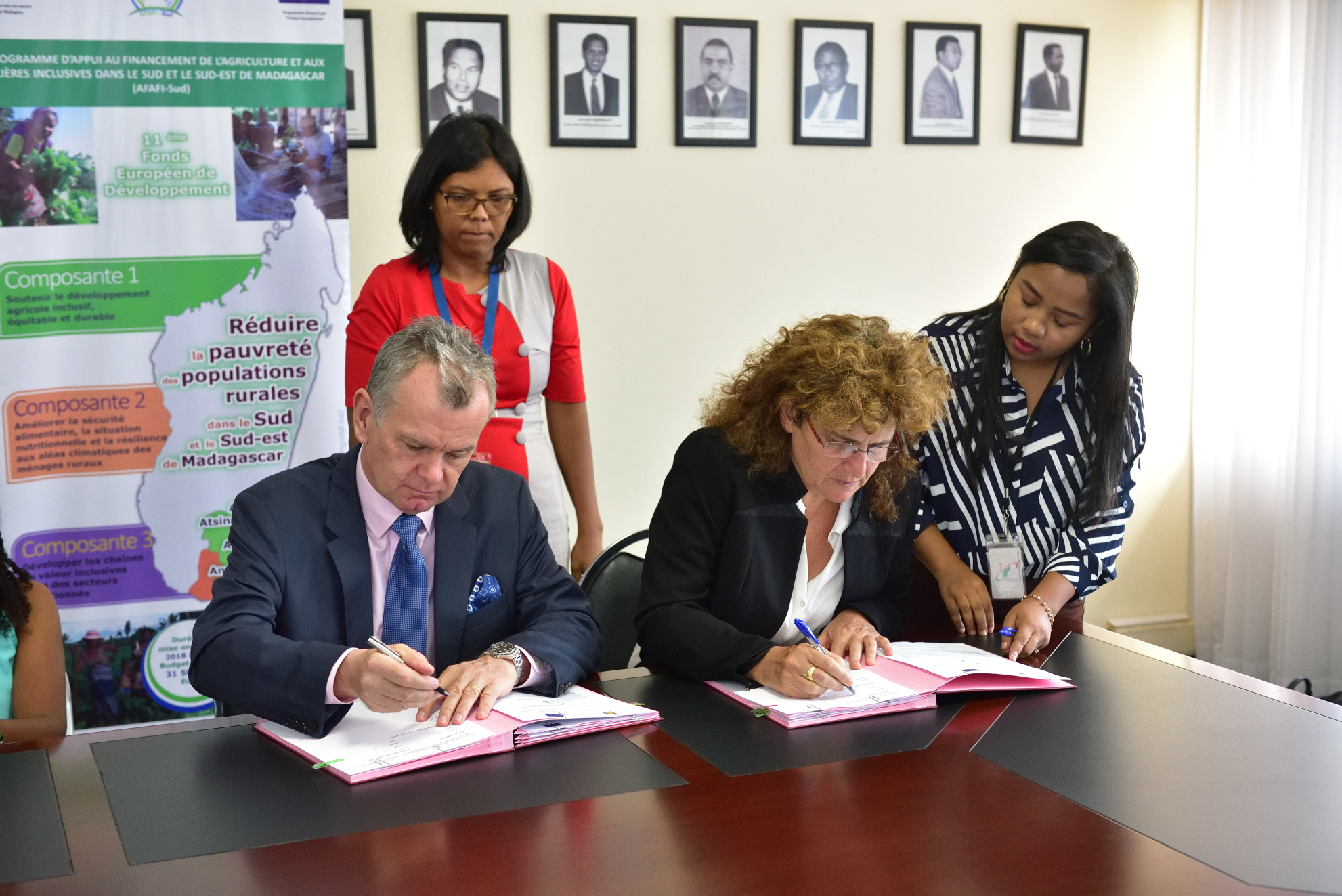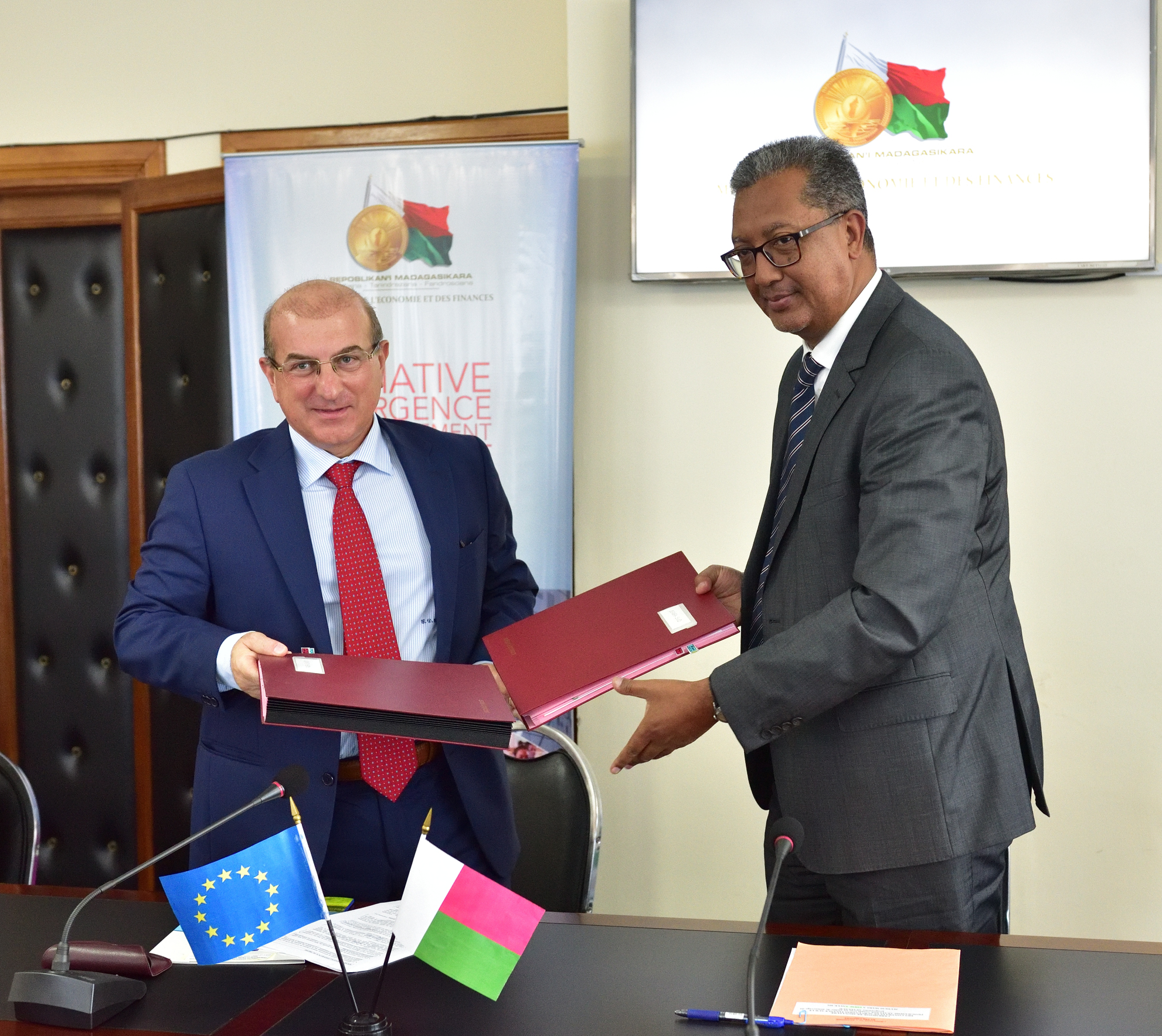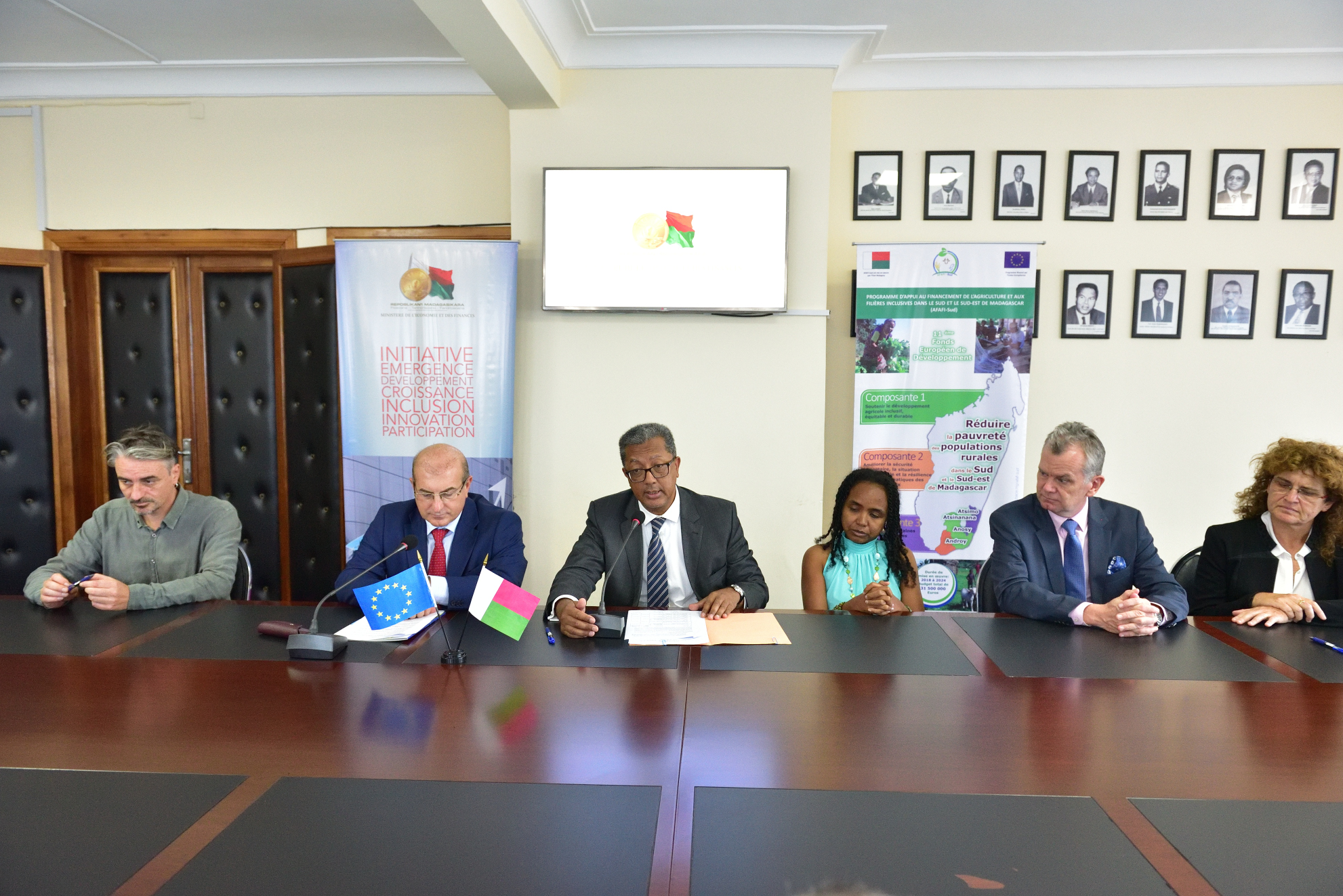 Antananarivo le 05 mars 2020 - La cérémonie de signature de 5 contrats de subvention financés dans le cadre du Programme d’Appui au Financement de l’Agriculture et aux Filières Inclusives dans le Sud de Madagascar (AFAFI- Sud) s’est tenue ce jour au Ministère de l’Economie et des Finances à Antaninarenina entre le Gouvernement Malagasy représenté par Monsieur Richard J. RANDRIAMANDRATO, Ministre de l'Economie et des Finances, Ordonnateur National du FED, SEM Giovanni Di GIROLAMO, l'Ambassadeur de l'Union européenne à Madagascar et les organisations partenaires (ONG et centres de recherches malgaches et internationaux). Le Programme AFAFI-Sud, financé par l’Union Européenne à hauteur de 30 Millions d’Euros dans le cadre du 11ème Fonds Européen de Développement, et cofinancé par la coopération allemande à hauteur de 1,5 millions d’euros, est mise en œuvre jusqu’en avril 2024 dans trois régions du Sud et du Sud-Est de Madagascar : ANDROY, ANOSY et ATSIMO ATSINANANA. Ces subventions permettront de renforcer « le soutien au développement agricole inclusif, équitable et durable » et « l’amélioration de la sécurité alimentaire, de la situation nutritionnelle et de la résilience aux aléas climatiques des ménages ruraux » au niveau de 34 communes rurales. A travers des appuis de proximité sur le terrain, les actions porteront sur : l'augmentation et la diversification de la production agricole pour la sécurité alimentaire, l'adaptation au changement climatique, l'accès à l'eau potable, la nutrition et l'hygiène, la restauration de l'environnement. Cette intervention est en ligne avec les objectifs du Plan Emergence Madagascar (PEM) et s'inscrit dans l'engagement 12 du PEM qui vise l'autosuffisance alimentaire. Présentation des contrats de subvention : Les 5 projets appuyés, financés à hauteur de 10 835 062,00 Euros (43,34 milliards d'Ariary) par l'Union européenne concerneront les actions et les zones suivantes :