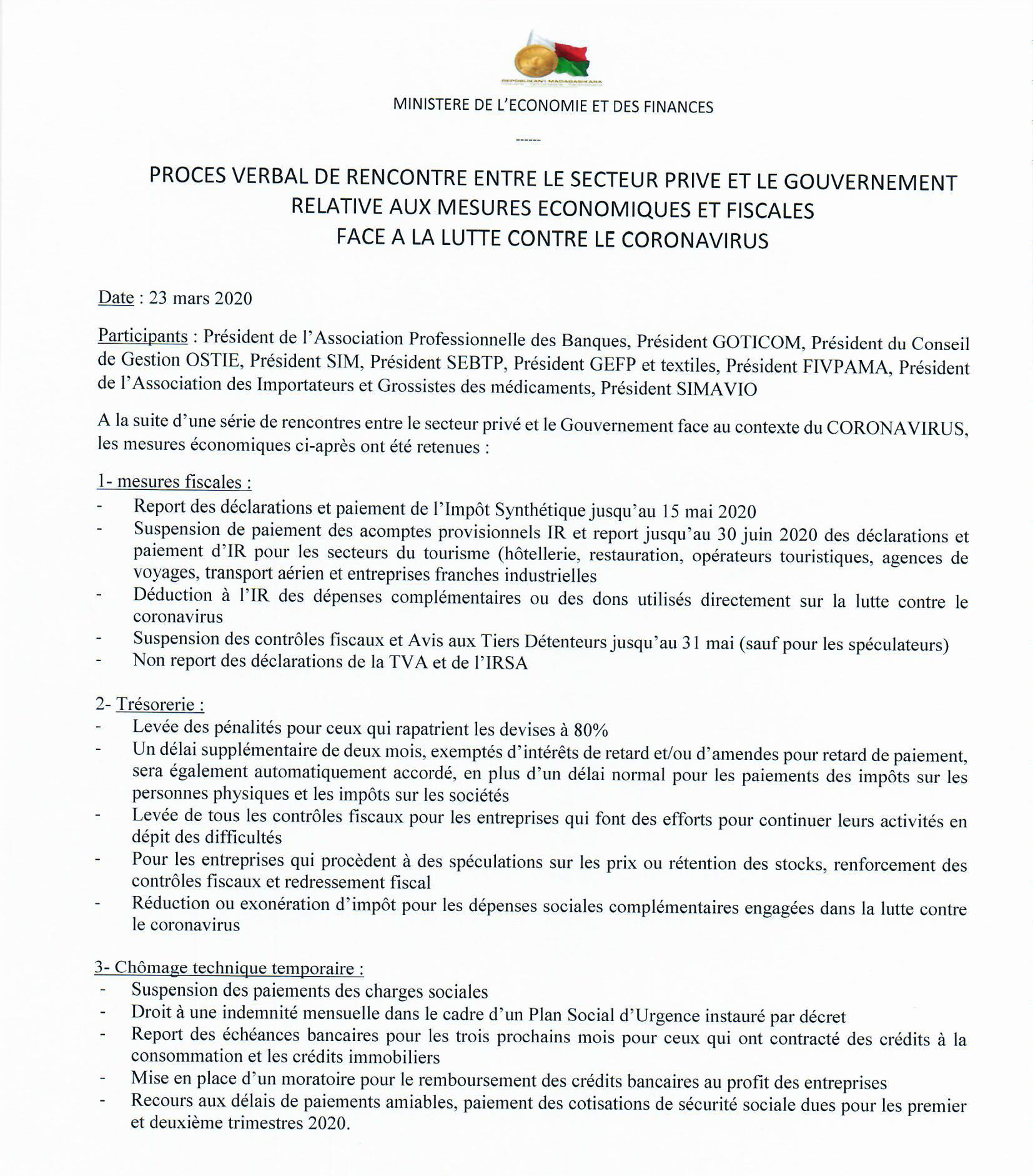 Procès verbal de rencontre entre le secteur prive et le Gouvernement relative aux mesures économiques et fiscales face à la lutte contre le coronavirus