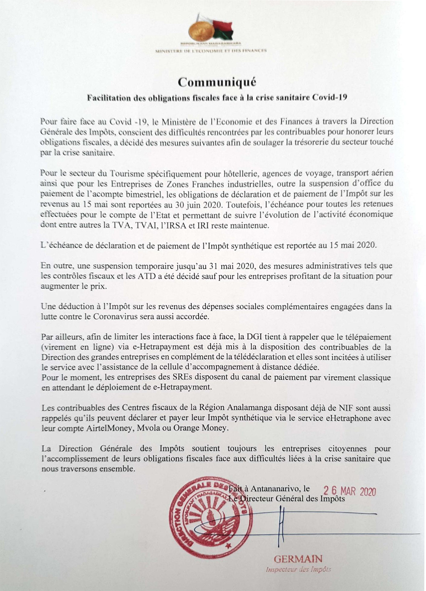 Facilitation des obligations fiscales face à la crise sanitaire Covid-19
