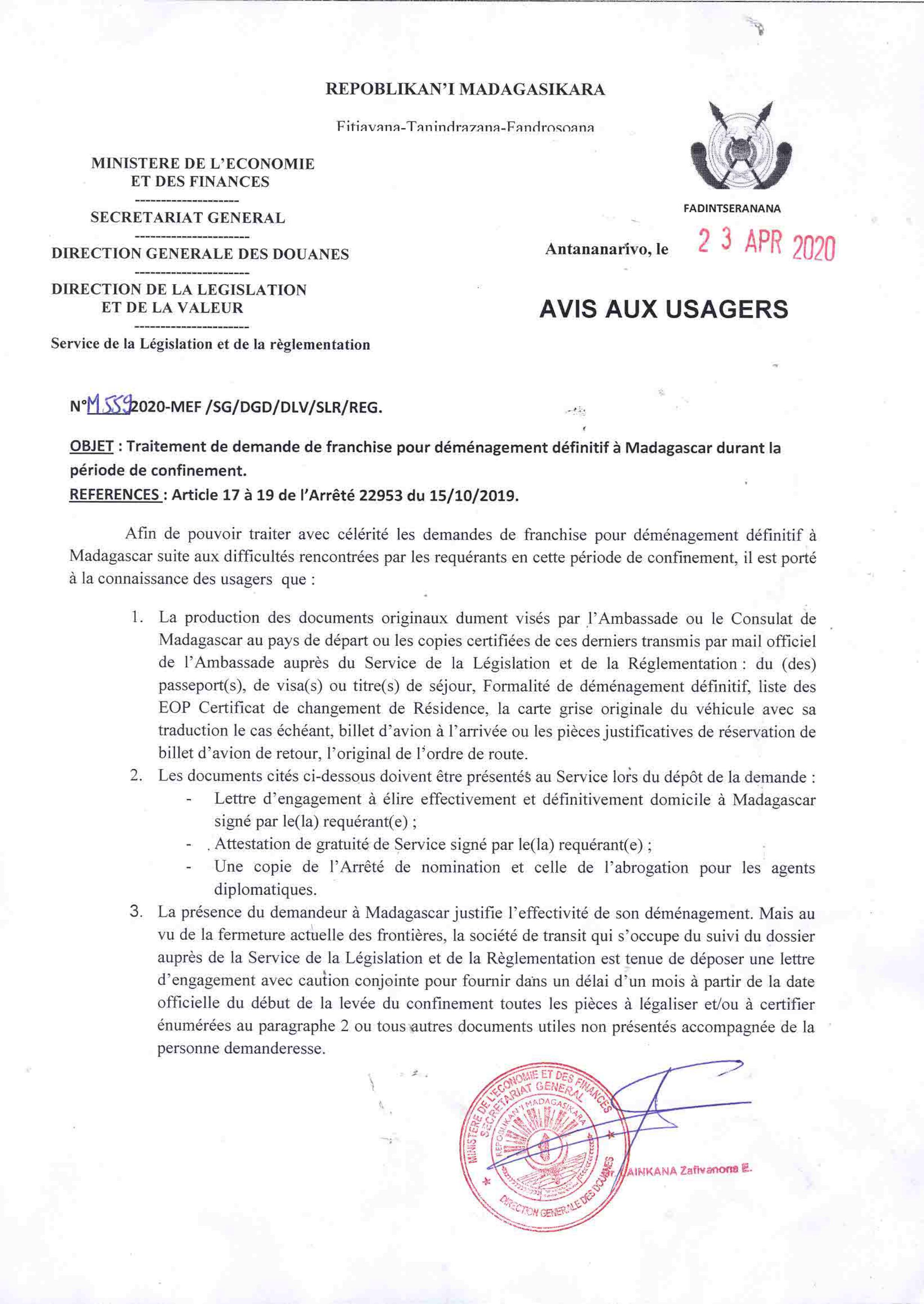 Douanes : Traitement de demande de franchise pour déménagement définitif à Madagascar durant la période de confinement