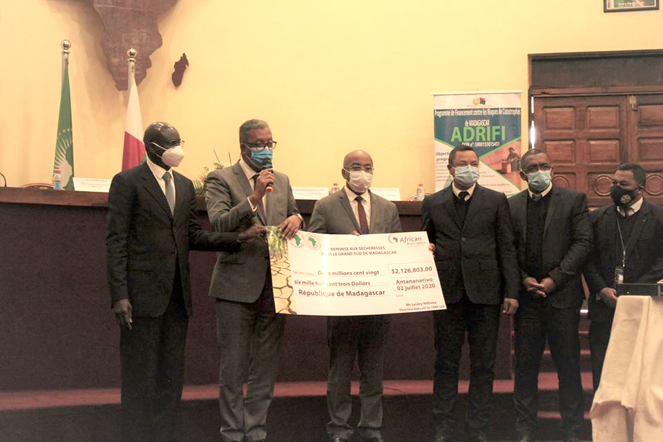 Le Gouvernement Malagasy a bénéficié d’un chèque de 2 126 803,00 USD de la part de la Société d’assurance de la Mutuelle panafricaine de gestion des risques (ARC Ltd) pour couvrir les pertes prévues en termes de moyens d'existence de sa population vulnérable en raison de l’insuffisance pluviométrique ayant provoqué des mauvaises récoltes durant la saison agricole 2019-2020.