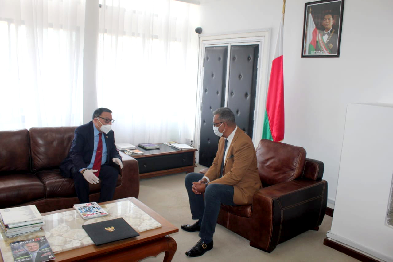 Le Ministre de l’Economie et des Finances Richard RANDRIAMANDRATO a reçu ce matin l’Ambassadeur de la Fédération de Russie à Madagascar, SEM Stanislav Akhmedov. En effet, la mission à Madagascar de ce diplomate arrive à son terme. Une occasion pour les deux parties d’évoquer ensemble l’importance des relations entre les deux pays. Le Ministre de l’Economie et des Finances et son hôte ont d’ailleurs fait un état des lieux de l’excellence de cette coopération qui est encore appelée à se renforcer. A mentionner que les investisseurs russes s’intéressent beaucoup sur les secteurs : tourisme, l’agriculture et l’agrobusiness, l’énergie, les mines, les infrastructures et la santé. Par ailleurs, la Russie a signé avec Madagascar un accord de conversion de la dette en 2015, et contribue ainsi au financement de plusieurs projets de développement axés dans des domaines prioritaires comme la santé, l’énergie, l’éducation et l’enseignement professionnel. Ainsi, quatre nouveaux projets sont en phase de préparation, en vue d’une prochaine signature. Il s’agit notamment du projet de modernisation et de simplification de l’accès aux soins médicaux, horizon 2025, pour un montant de 73.915.926 USD ; du projet d’acquisition de 2 hélicoptères médicaux , du projet de renforcement du réseau national des laboratoires des maladies infectieuses dangereuses pour un montant de 4.309.822,69 USD et enfin du projet d’installation d’un ensemble d’équipements pour moderniser les systèmes de désinfection de l’eau dans les institutions médicales de 25 millions USD.