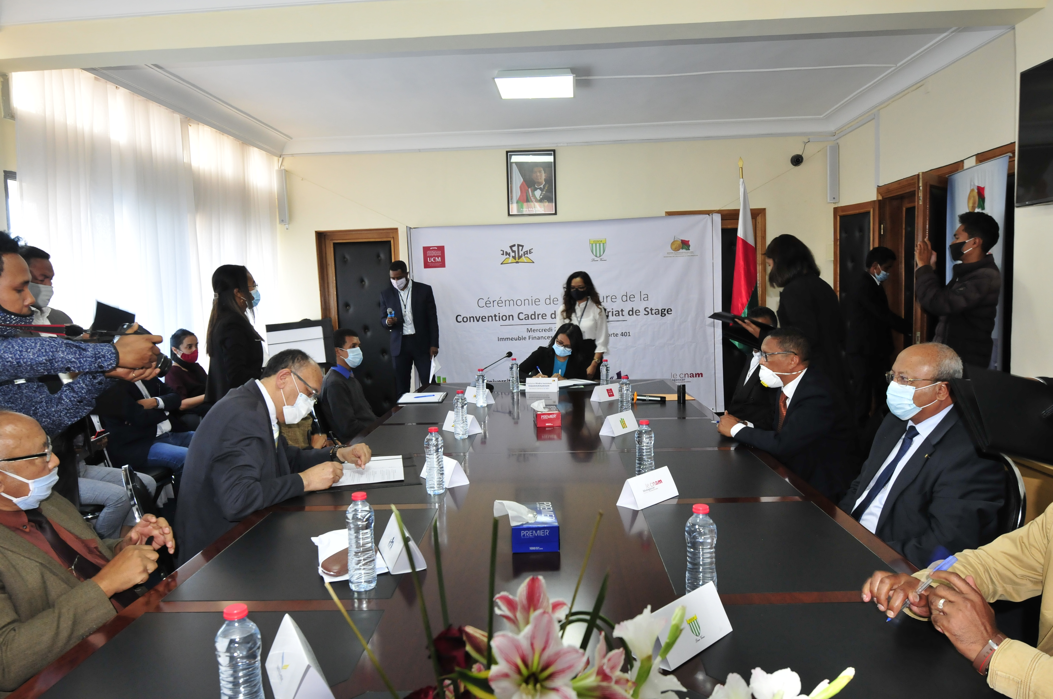 Coïncidant aux aspirations de son Excellence Monsieur le Président de la République de Madagascar et de Monsieur le Ministre de l’Economie et des Finances dans le « Velirano », le Ministère a toujours tenu à cœur, dans sa mission de service public, l’insertion des jeunes à l’emploi pour assurer l’avenir du Pays, afin de garantir une Émergence réelle de Madagascar. C’est dans cette perspective que le MEF s’est engagé dans le projet de renforcer sa coopération avec les Etablissements de formations supérieures de prestige du Pays. Pour marquer le pas, huit Etablissements de renommés étaient présents lors de la première vague de la cérémonie de signature de la convention cadre avec Madame le Secrétaire Général en tant que représentante du MEF. Cet évènement s’est tenu dans les locaux de l’immeuble des Finances Antaninarenina, le mercredi 28 octobre 2020 à 16 heures. A l’issu de cette convention, ces Etablissements sont désormais Partenaires exclusifs du Ministère en matière de stage. Ce projet a pour objectif de permettre aux étudiants des Etablissements Partenaires d’acquérir des expériences et des expertises professionnelles en permettant à leur étudiant d’effectuer leur stage au sein du Ministère. Mais bien plus encore, les deux acteurs pourront accentuer leurs actions dans la lutte contre la corruption notamment par une collaboration en matière d’éradication d’usage des faux diplômes, et pourront se consulter pour l’élaboration de programme de recherche collaboratif, et proposer aux agents du Ministère des formations en partenariat avec les Établissements de formation.