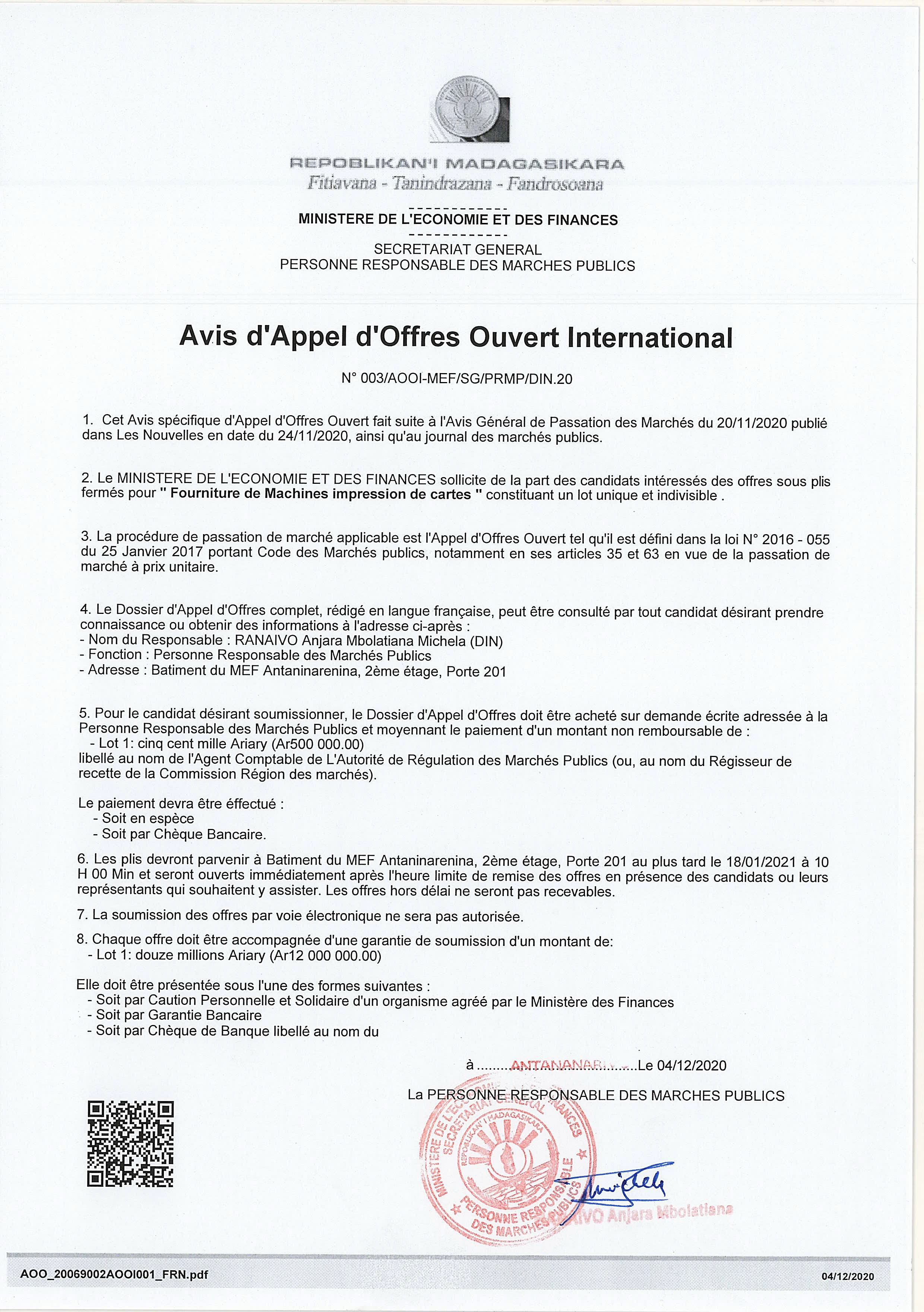 Avis d'Appel d'Offres Ouvert International : Fourniture  de machines impression de cartes