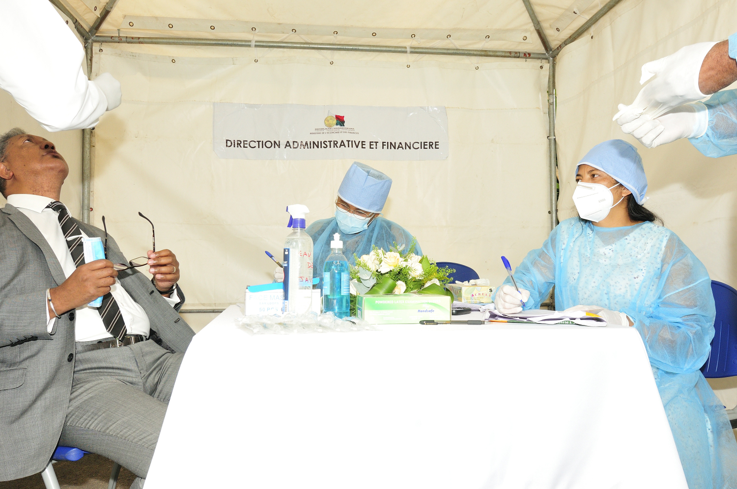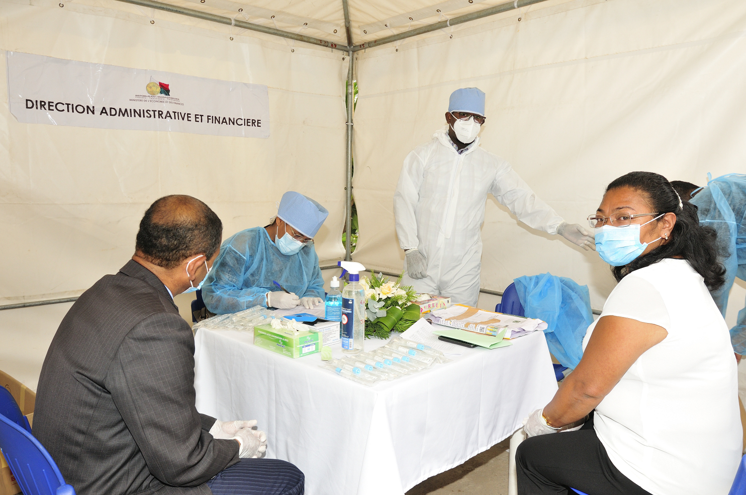 Des tests de dépistage du COVID19 ont été réalisés au sein du Ministère de l’Economie et des Finances. Antananarivo, le 01er février 2021. En marge de la levée des couleurs de ce lundi 1er février 2021, des dispostifs ont été mis en place au sein du Ministère de l’Economie et des Finances afin de réaliser des tests de dépistage du COVID19. Cette initiative a été réalisée à la demande de Monsieur Randriamandrato Richard, Ministre de l’Economie et des Finances. Elle vient en appui aux efforts déployés jusqu’ici afin de limiter la propagation de ce virus au sein du MEF. Selon les statistiques nationales, officiellement publiées par le Ministère de la Santé Publique, la situation à Madagascar, allant du 23 au 29 janvier 2021 fait état de 322 nouveaux cas, 285 guéris, 569 en traitement, et 2 décès. Ces chiffres constituent le résultat de 3376 tests réalisés pendant la période citée. « Les Agents jugés vulnérables ainsi que ceux qui ont eu des cas contacts ont été priorisés pour le dépistage », explique le Docteur Ronibary Andritiana Fanomezantsoa, chef du Centre Médico-Social (CMS) au sein de la DAF. Le Directeur des Ressources Humaines, Razafinimpiasa Mahandritiana, explique quant à lui, « qu’une liste a été préalablement établie avec l’aide du CMS. A cela s’ajoute 5 Agents issus de chaque direction générale au sein du Ministère ». En donnant l’exemple, le Ministre en personne s’est fait dépisté. En parallèle à cette initiative, la Direction Générale des Impôts (DGI) a également déployé des moyens pour lutter contre la pandémie dans ses locaux. Outre les barrières sanitaires qui sont toujours appliquées, ses bureaux à travers Madagascar ont été munis d’alcool, de thermomètres, de virucide, de pulvérisateur, de gel hydroalcoolique. Des boîtes de « CVO plus » ont été distribuées à ses Agents. |