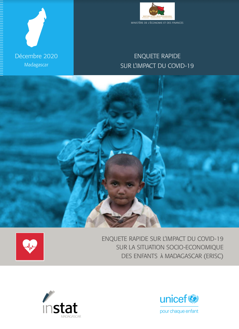 COMMUNIQUE DE PRESSE CONJOINT Enquête Rapide sur l’Impact Socio-économique du COVID-19 sur la situation des enfants à Madagascar (ERISC) : Les enfants souffrent aussi des conséquences de la pandémie Antananarivo, le 02 avril 2021. Une nouvelle enquête montre que la vie des enfants à Madagascar est devenue encore plus difficile en raison de la pandémie de Covid-19. L'enquête, réalisée par le Ministère de l’Économie et des Finances, par l’intermédiaire de l'Institut National de la Statistique (INSTAT), avec le soutien technique et financier de l'UNICEF Madagascar, au cours du mois de septembre 2020 montre des impacts négatifs dans les domaines de l'éducation, de la santé et de l'eau, de l'assainissement et de l’hygiène :
