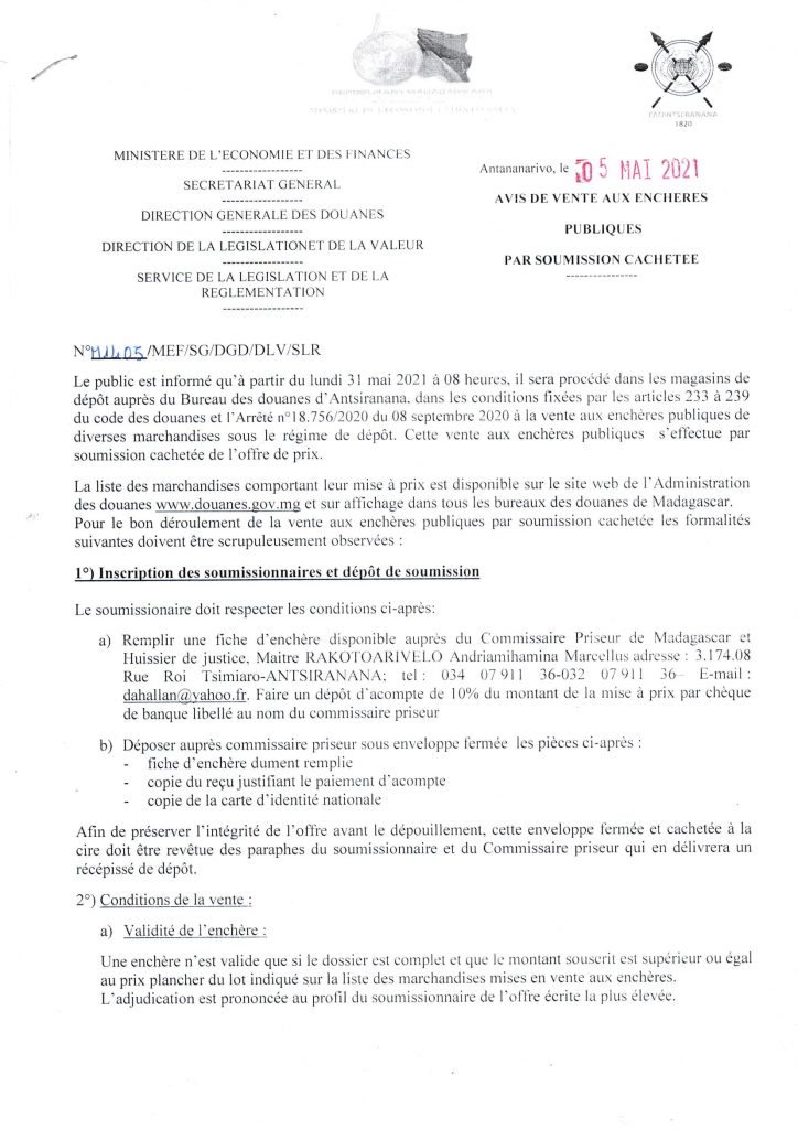 Avis de vente aux enchères N°M1405 du 05/05/2021 Le Public est informé qu’à partir du Lundi 31 Mai 2021 à 08 heures, il sera procédé dans les magasins de dépôt auprès du Bureau des douanes d’Antsiranana, dans les conditions fixées par les articles 233 à 239 du Code des douanes et l’Arrêté n°18.756/2020 du 08 septembre 2020 à la vente aux enchères publiques de diverses marchandises sous le régime de dépôt. Cette vente aux enchères publiques s’effectue par soumission cachetée de l’offre du prix. |