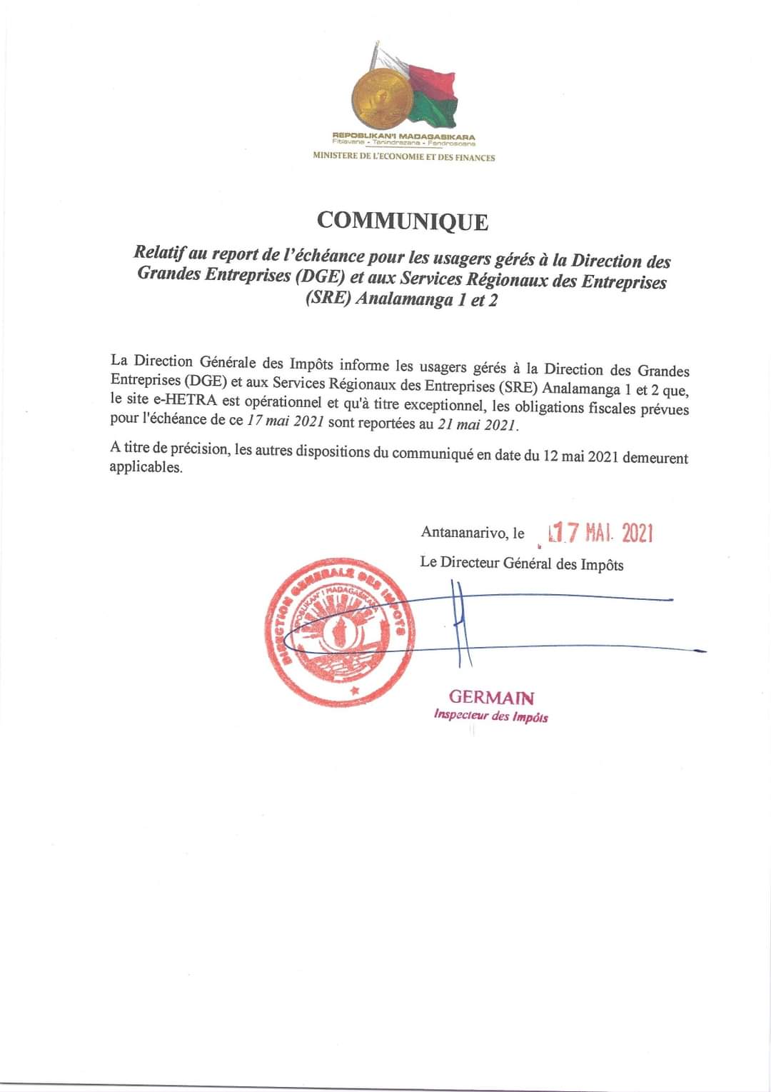 Communiqué relatif au report de l’échéance pour les usagers gérés à la Direction des Grandes Entreprises (DGE) et aux Services Régionaux des Entreprises (SRE) Analamanga 1 et 2