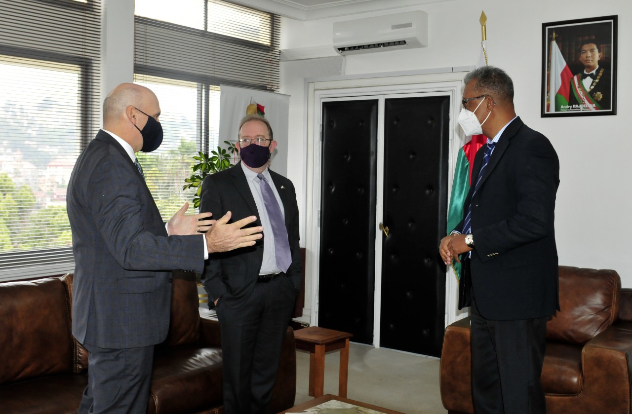 Fitsidihana ara-pomba fanajana nataon’ny Ambasadaoron’ny Etazonia Tonga nitsidika ny Minisitry ny Toekarena sy ny Fitantanam-bola, Andriamatoa Richard Randriamandrato ny Ambasadaoron’ny Etazonia miasa sy monina eto Madagasikara, Andriamatoa Michael Peter Pelletier.
