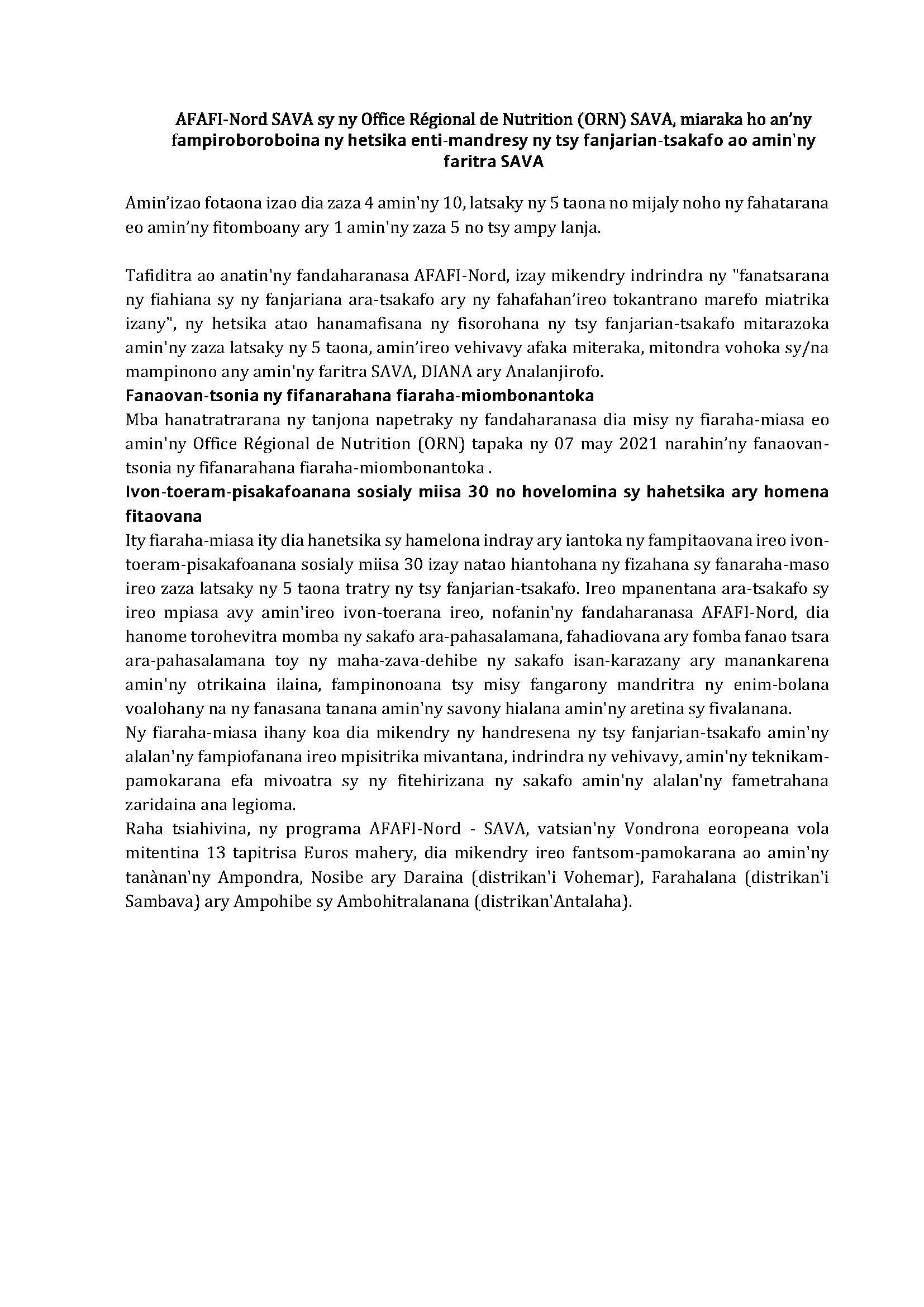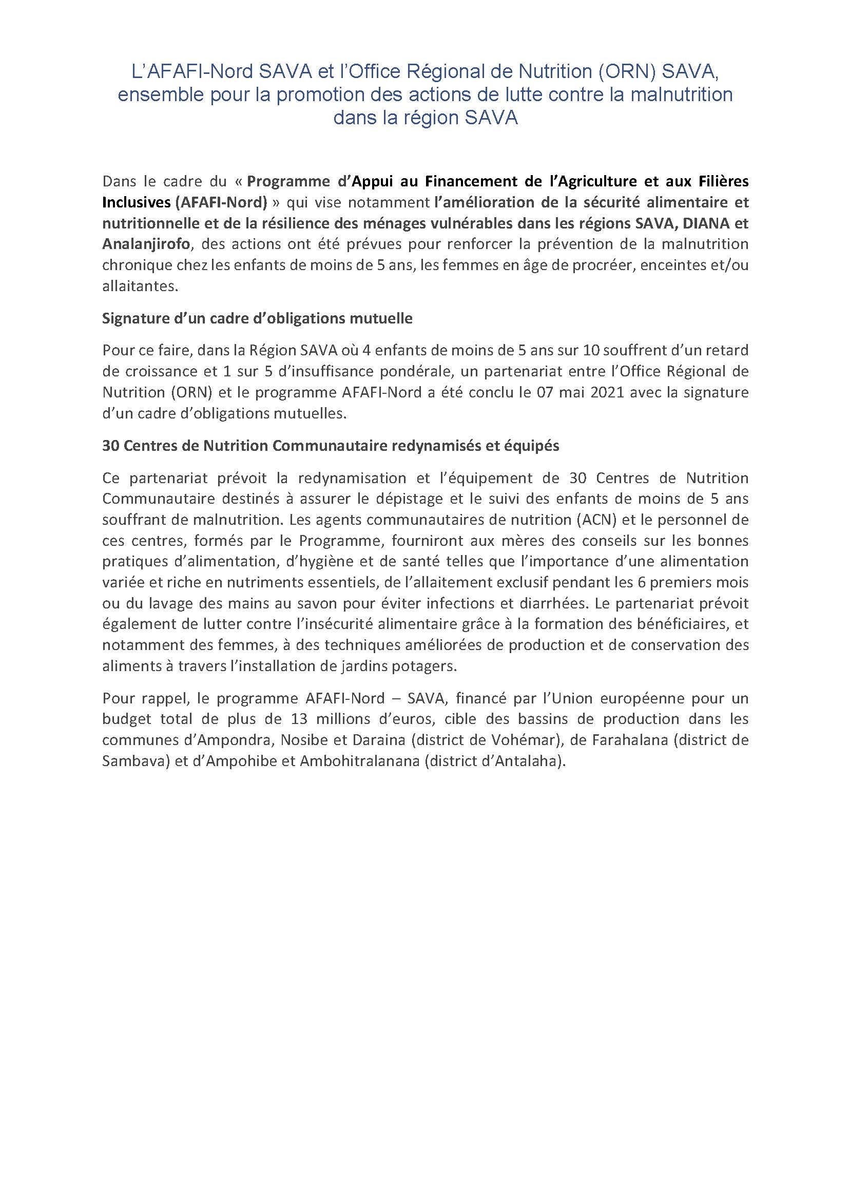 L’AFAFI-Nord SAVA et l’Office Régional de Nutrition (ORN) SAVA, ensemble pour la promotion des actions de lutte contre la malnutrition dans la région SAVA