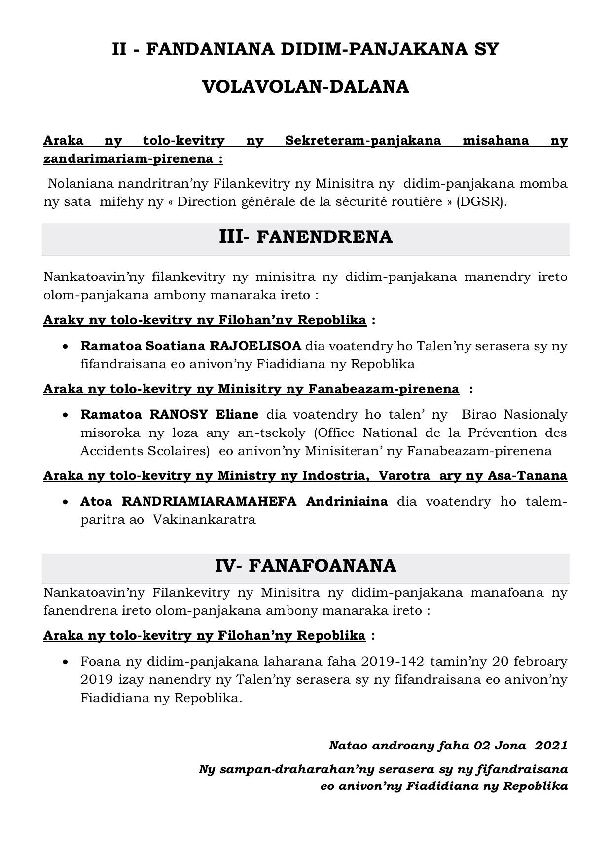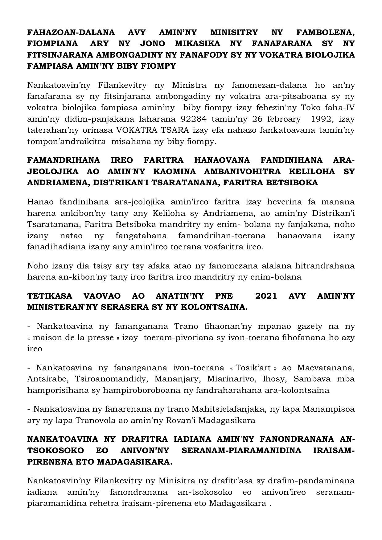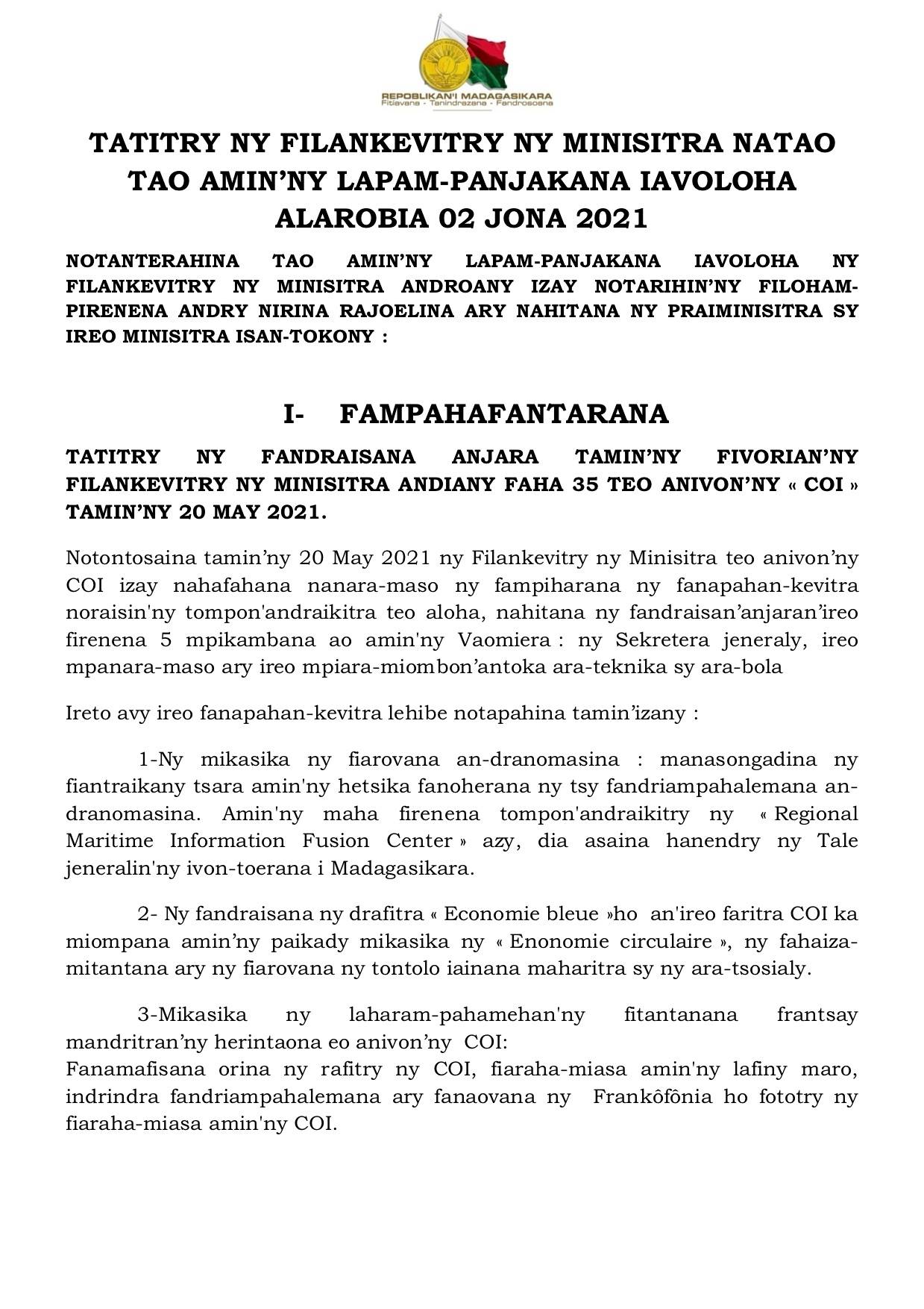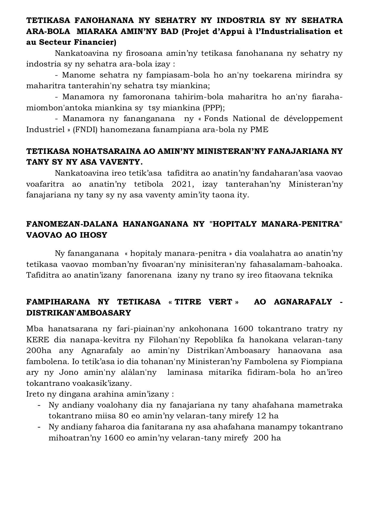 Tatitry ny Filankevitry ny Minisitra natao ny alarobia 02 Jona 2021 Projet d’Appui à l’Industrialisation et au Secteur Financier