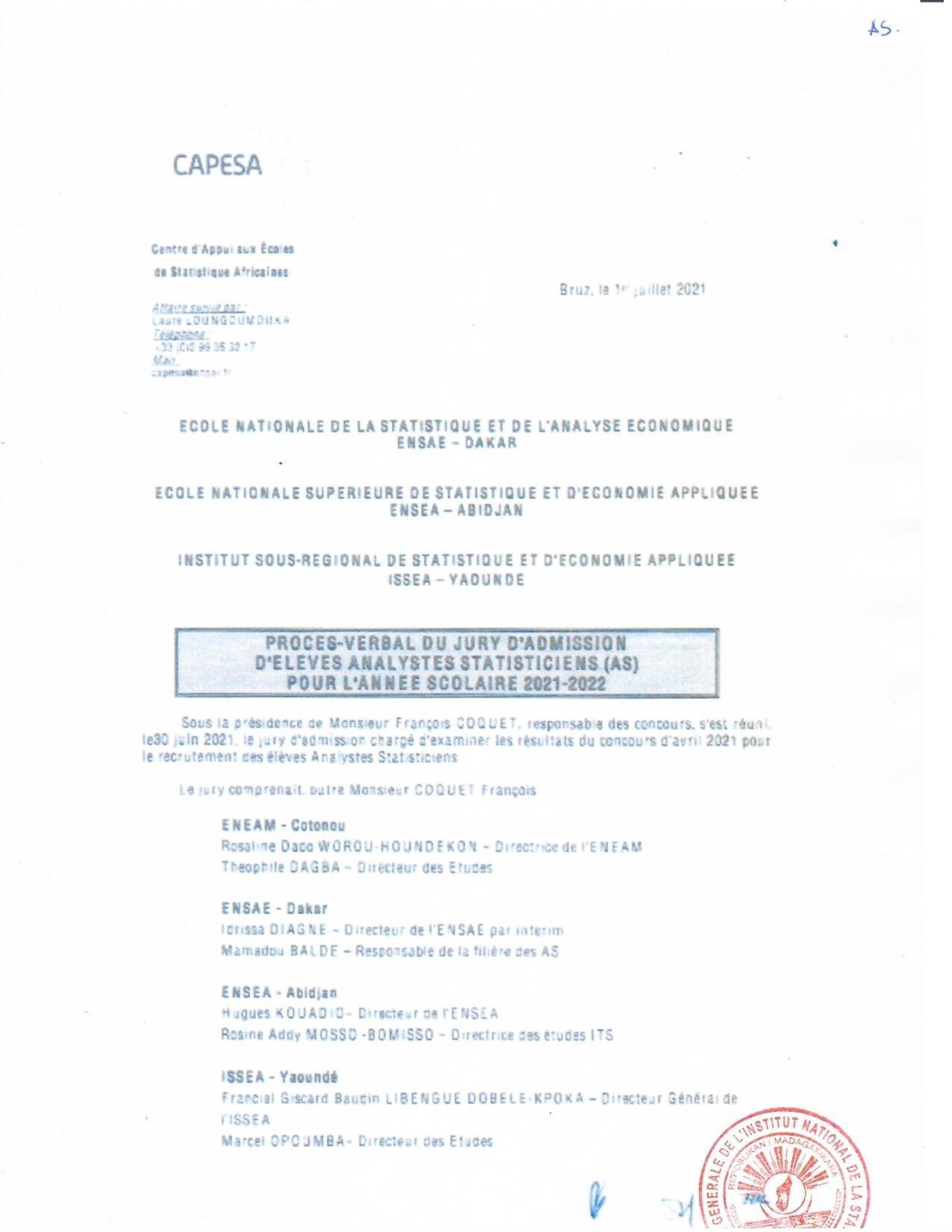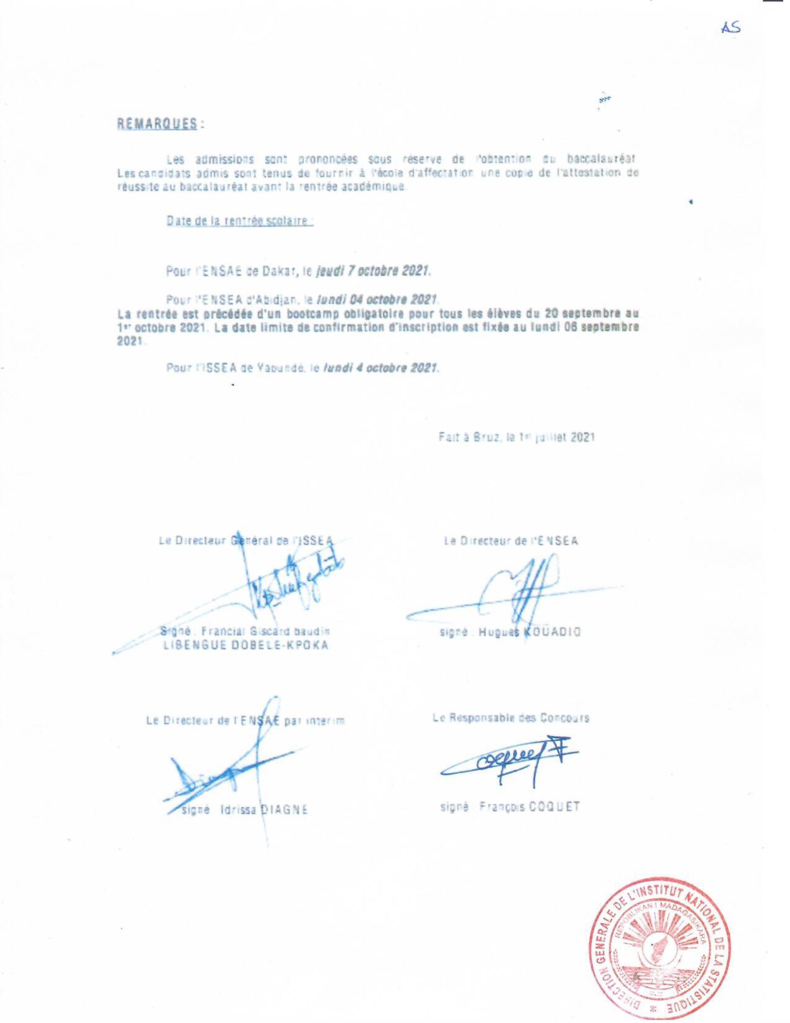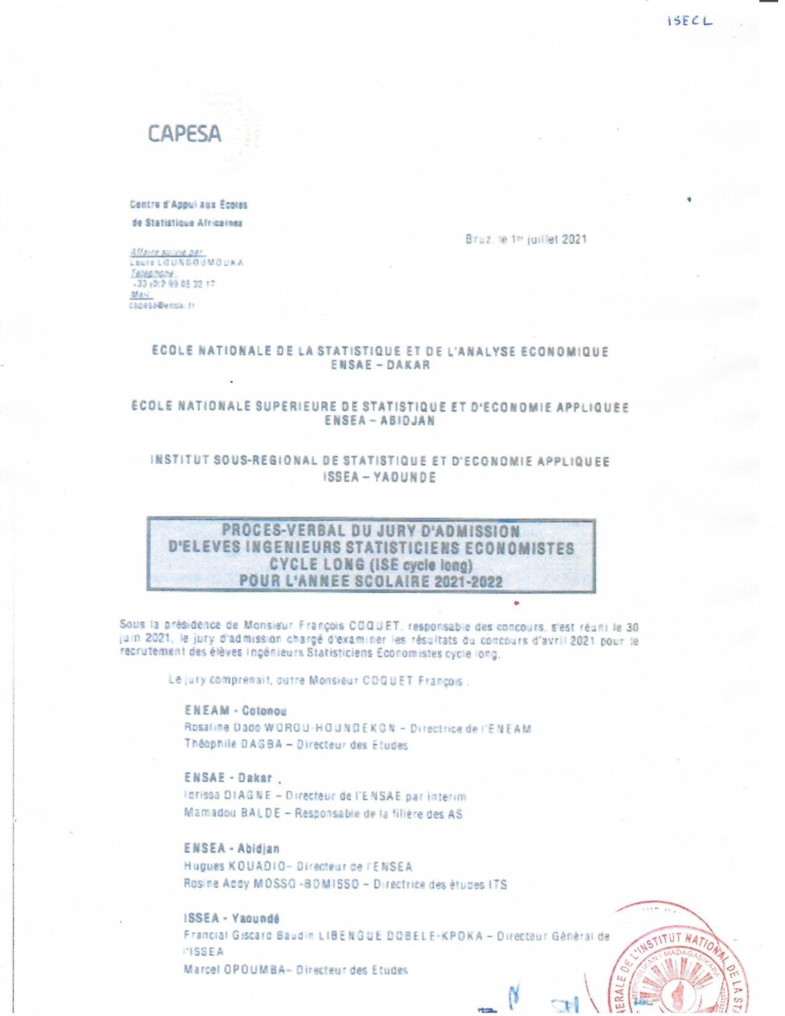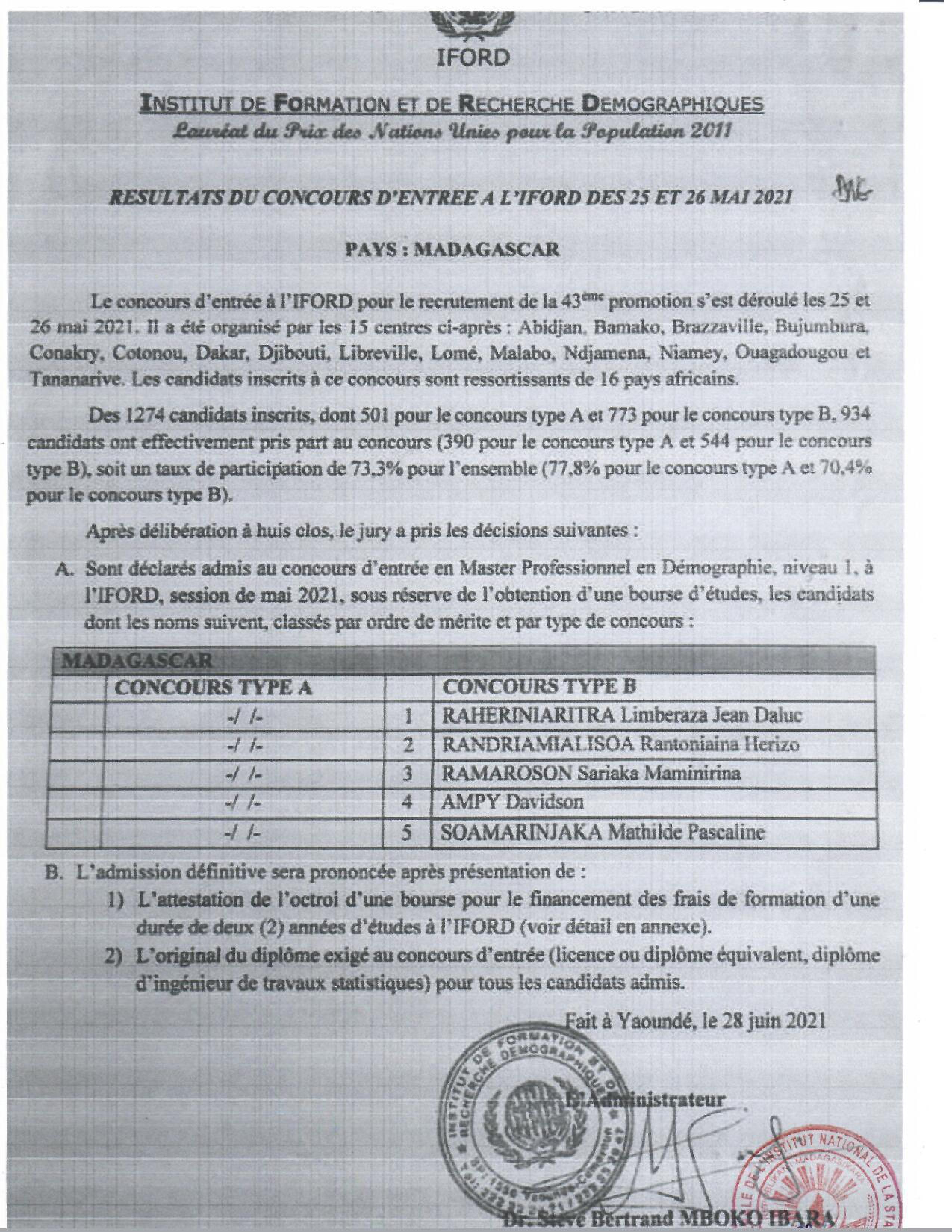 INSTAT : Résultats des concours pour les candidatures en IFORD, ISE et AS La liste des candidats admis au concours pour le recrutement d' Élèves en Master Professionnel en Démographie, niveau I à l'IFORD, session de mai 2021 (i), d’ Élèves Ingénieurs Statisticiens Économistes (ISE) cycle long pour l'année scolaire 2021-2022 (ii) et d’ Élèves Analystes Statisticiens (AS) pour l'année scolaire 2021-2022 (iii), est publiée. Toutes nos félicitations aux candidats admis.