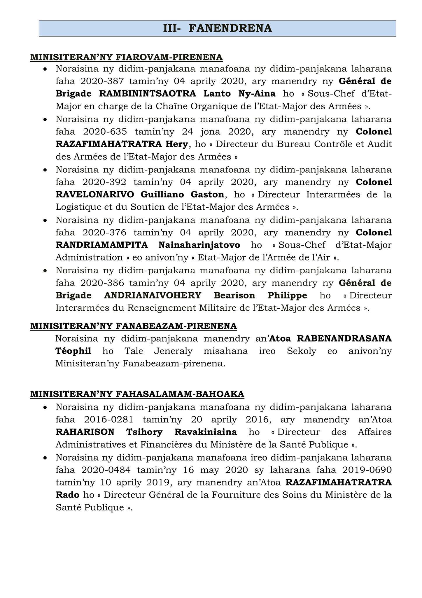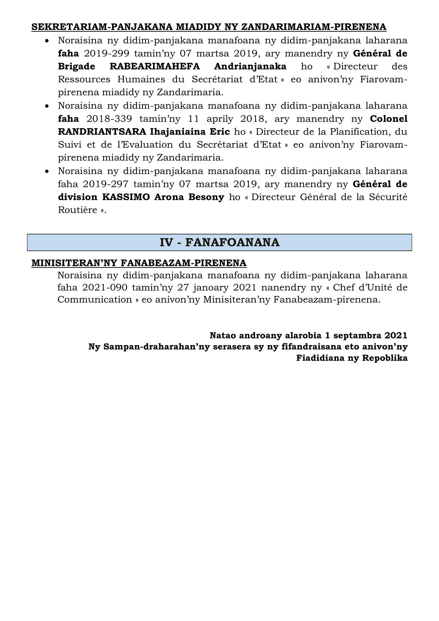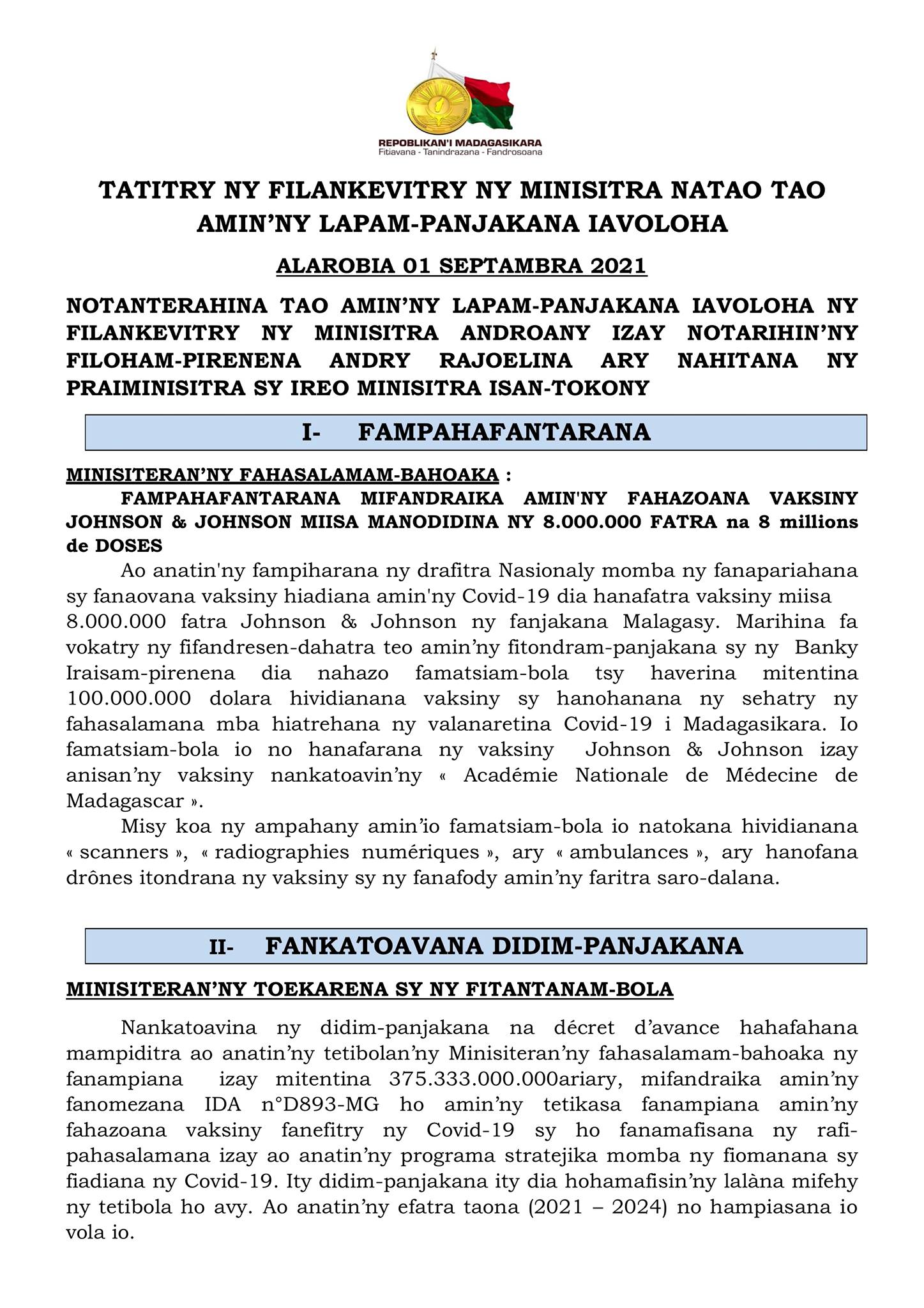 Tatitry ny Filankevitry ny Minisitra natao ny alarobia 1 septambra 2021 ![]() ![]() ![]() |