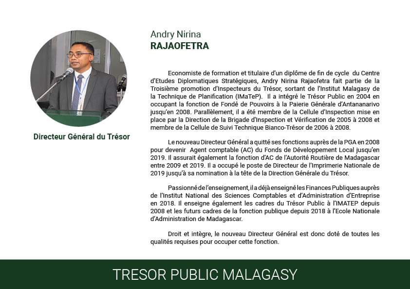 Tafapetraka ny Tale jeneralin'ny Tahirimbolam-panjakana Notanterahina ny marainan'ny 9 Septambra 2021 ny famindram-pitantanana teo amin’i RAJAOFETRA Andry Nirina, Tale Jeneraly vaovao eto anivon’ny Tahirimbolam-panjakana sy RANJALAHY Ihaja, Tale Jeneraly teo aloha. Tonga nanatrika ny fotoana ny Minisitry ny Toekarena sy Fitantanam-bola, RABARINIRINARISON Rindra Hasimbelo sy ny Sekretera Jeneralin'ny Minisitera, RAMANAMPANOHARANA Andry ary ireo tomponandraikitra isan-tsokajiny ato amin'ny Minisitera. Nandritra ny fandraisany fitenenana dia nankasitraka, nisaotra tamin’ny fiaraha-miasa ny Tale Jeneraly teo aloha. Nanambara izy fa ny asa rehetra dia natao tao anaty fitiavan-tanindrazana. Nohajaina koa ny fenitra sy ny lalàna mifehy ny fitantanana ny volam-panjakana. Mirary ny Tale Jeneraly vaovao izy mba hitondra ny fanavaozana sy fitantanana ny Tahirimbolam-panjakana ao anaty fangaraharana. Nanome toky kosa ny Tale Jeneraly vaovao fa hanatanteraka amin'ny antsakany sy andavany ny asa andrasan'ny Filoham-pirenena sy ny Praiminisitra ary ny Minisitra aminy dia ny "Hiasa mahitsy ho lavitry ny kolikoly". Nitsodrano azy hahefa be amin'izany adidy miandry azy izany ny Tale Jeneraly teo aloha. Ramatoa Minisitra kosa dia nankasitraka manokana ny mpiara-miasa ato amin'ny Tahirimbolam-panjakana noho ny faharetana tamin'izao fanendrena izao. Tsy natao an-kahamehana na an-kitohatoha hoy izy ny fanendrena fa nohalalinina tsara niaraka tamin'ny Filoham-pirenena sy ny Praiminisitra.