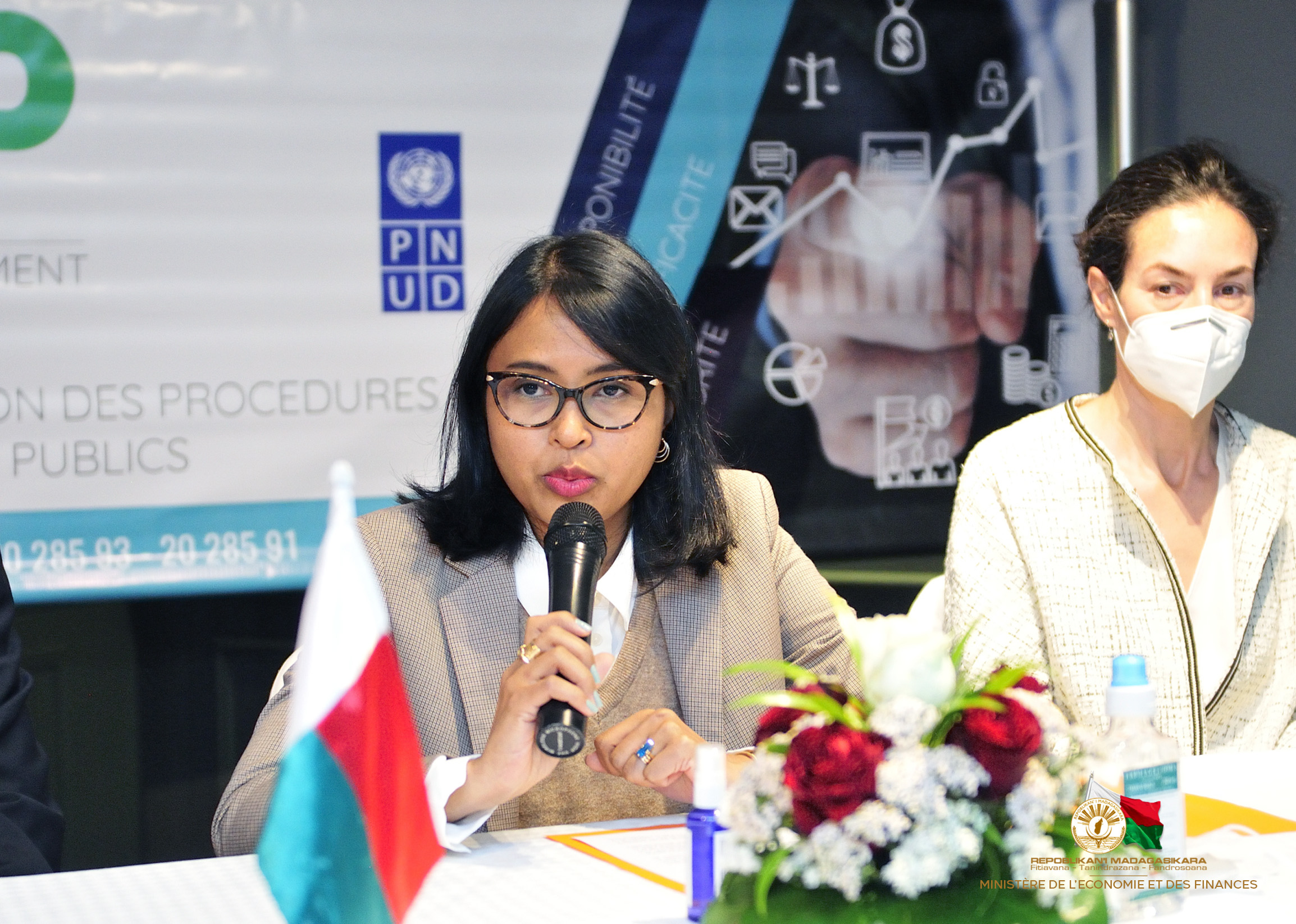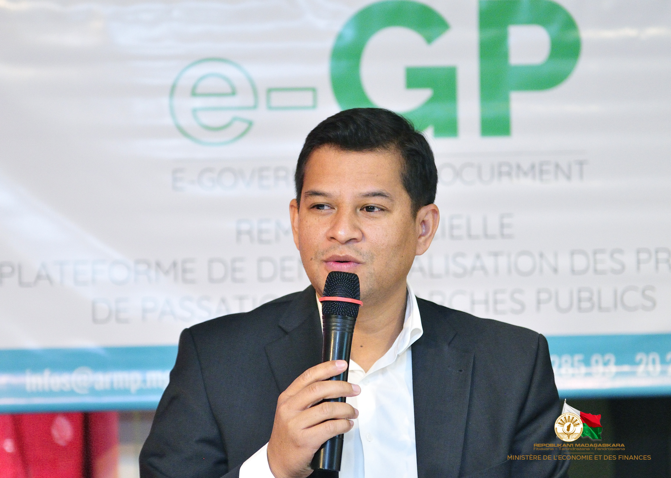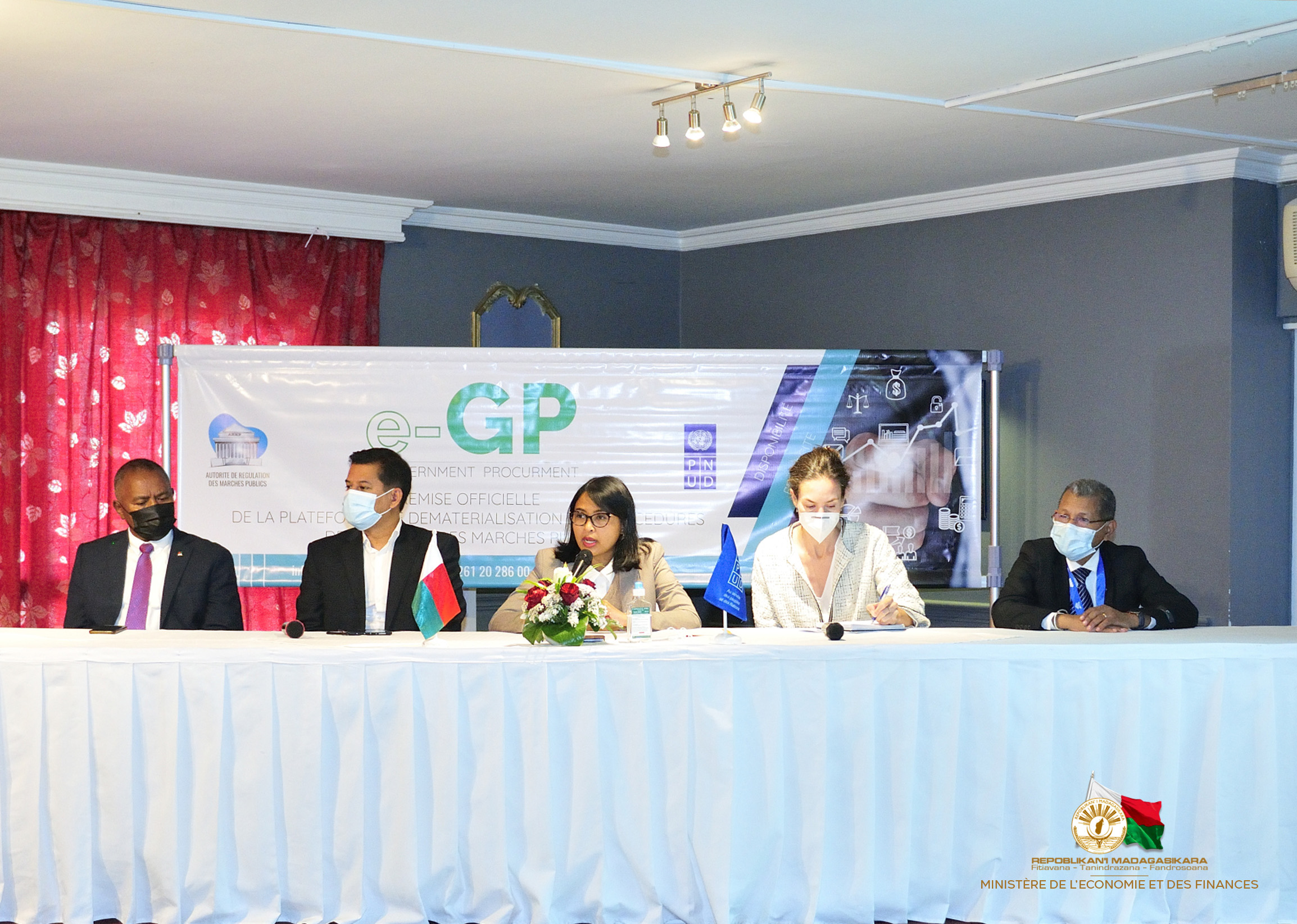 e-GP : améliorer le processus de passation et d’exécution des marchés publics Antananarivo, le La nouvelle plateforme en ligne e-GP (e-Government Procurment), remise officiellement ce jour à « l'Autorité de Régulation des Marchés Publics », à l’hôtel Colbert Antaninarenina, permet à travers ses différentes fonctionnalités l’automatisation des différentes étapes de passation et d’exécution des marchés publics dont : l’édition du plan annuel de Passation de marchés via l'e-planification, l'automatisation de l’édition du dossier d’appel d’offre via e-dossier, la gestion du paiement en ligne via e-paiement, la soumission électronique des offres via e-soumission, l'automatisation des évaluations des offres via e-évaluation, l'automatisation de l’édition du contrat via e-contrat et la gestion même du contrat à travers la fonction e-management. En outre, elle permet également d’effectuer des échanges de données entre les différentes entités impliquées dans le processus de passation de marchés à savoir la Commission Nationale des Marchés (CNM), la Banque Centrale de Madagascar (BFM), la Direction Générale des Impôts (DGI), la Direction Générale du Trésor (DGT), les banques primaires et les opérateurs en mobile Banking. E-GP mène vers une plus grande transparence des marchés publics, à une plus grande participation des opérateurs économiques principalement le secteur privé qui peuvent désormais effectuer leurs soumissions par voie électronique et permet à la société civile d’effectuer des consultations des marchés publics passés par l’Administration publique. Par ailleurs, après cette présentation, tous les acteurs de Grande Ile suivront une formation qui sera la base du déploiement du système. Cette plateforme en ligne a été développée avec l'appui du Programme des Nations Unies pour le Développement (PNUD) à travers son projet de Gestion Budgétaire pour la Croissance Inclusive (GBCI) pour l’atteinte des objectifs de développement durable mis en œuvre en partenariat avec le Ministère de l'Economie et des Finances. Le Ministre de l’Economie et des Finances, Madame Rindra Hasimbelo RABARINIRINARISON