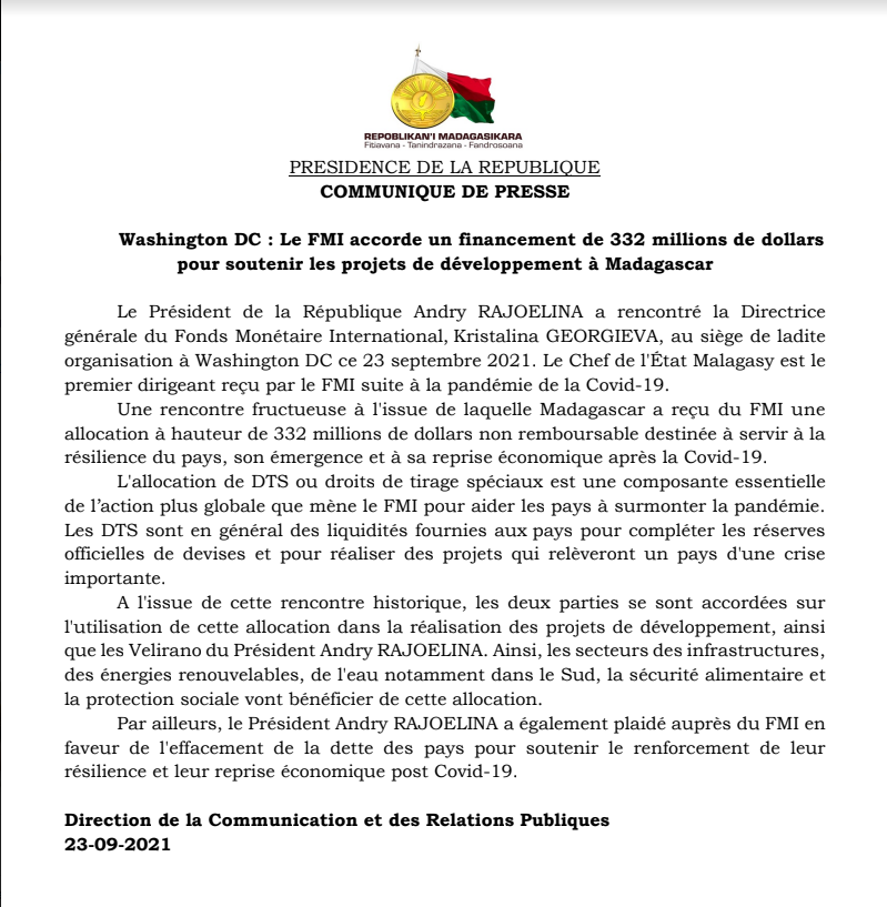 Une rencontre durant laquelle Madagascar a reçu l'allocation du montant le plus élevé de tous les DTS de l'histoire : une allocation spéciale de DTS (Droits de Tirages Spéciaux) de 332 Millions USD non remboursable. Ces fonds, immédiatement disponibles, sont destinés à servir à la résilience du Pays et à sa reprise économique après le COVID 19. Notamment dans les projets de développement dans différents secteurs clés comme des projets d'infrastructures, d'énergie renouvelable, de protection sociale, d'adduction d'eau dans le Sud et de lutte contre la malnutrition. Cette liste n’est toutefois pas exhaustive.