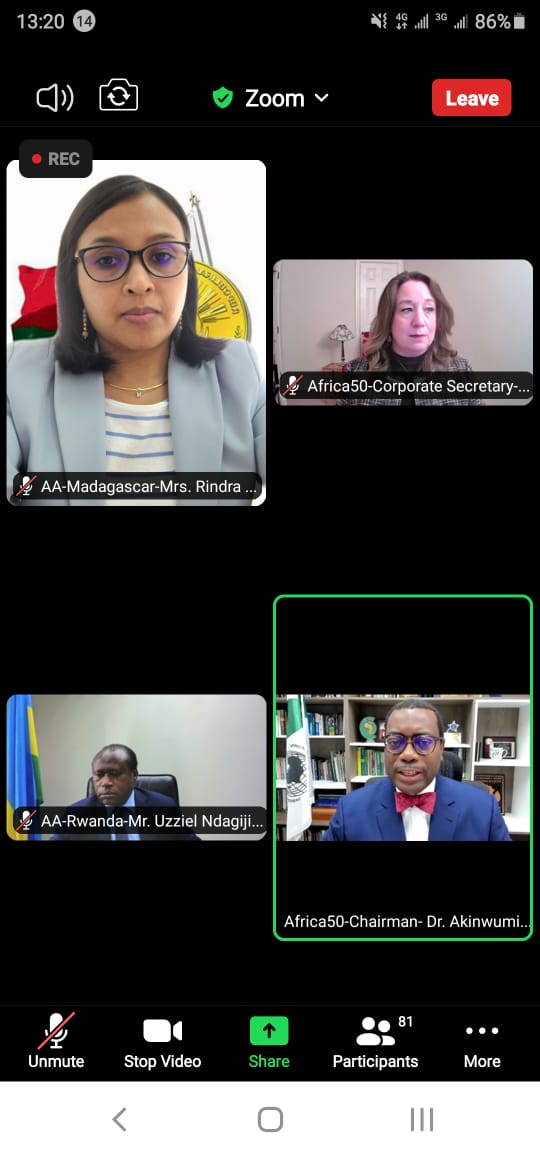 Participation de Madagascar à une réunion d’Africa50 Le Ministre de l’Economie et des Finances, Rindra Hasimbelo RABARINIRINARISON a participé, hier 05 octobre 2021 en visioconférence, à l’Assemblée Générale des Actionnaires (AGA) des pays membres de l’Africa 50, la plateforme panafricaine d’investissement dans les infrastructures. Pour rappel, Africa 50 est une institution financière à orientation commerciale ayant pour objectif le financement des infrastructures en Afrique en promouvant le développement des infrastructures en Afrique à l’aide de fonds provenant de sources diverses et en participant activement au financement de constructions, de réhabilitations, d’amélioration ou d’expansion de projets d’infrastructures financièrement et économiquement viables. La participation de Madagascar à cette réunion revêt une importance capitale du fait de la priorité accordée par SEM le Président de la République aux projets visant à combler les déficits en infrastructure dans le pays. Des priorités qui constituent la base de ses 13 Velirano et également bases du développement du pays.