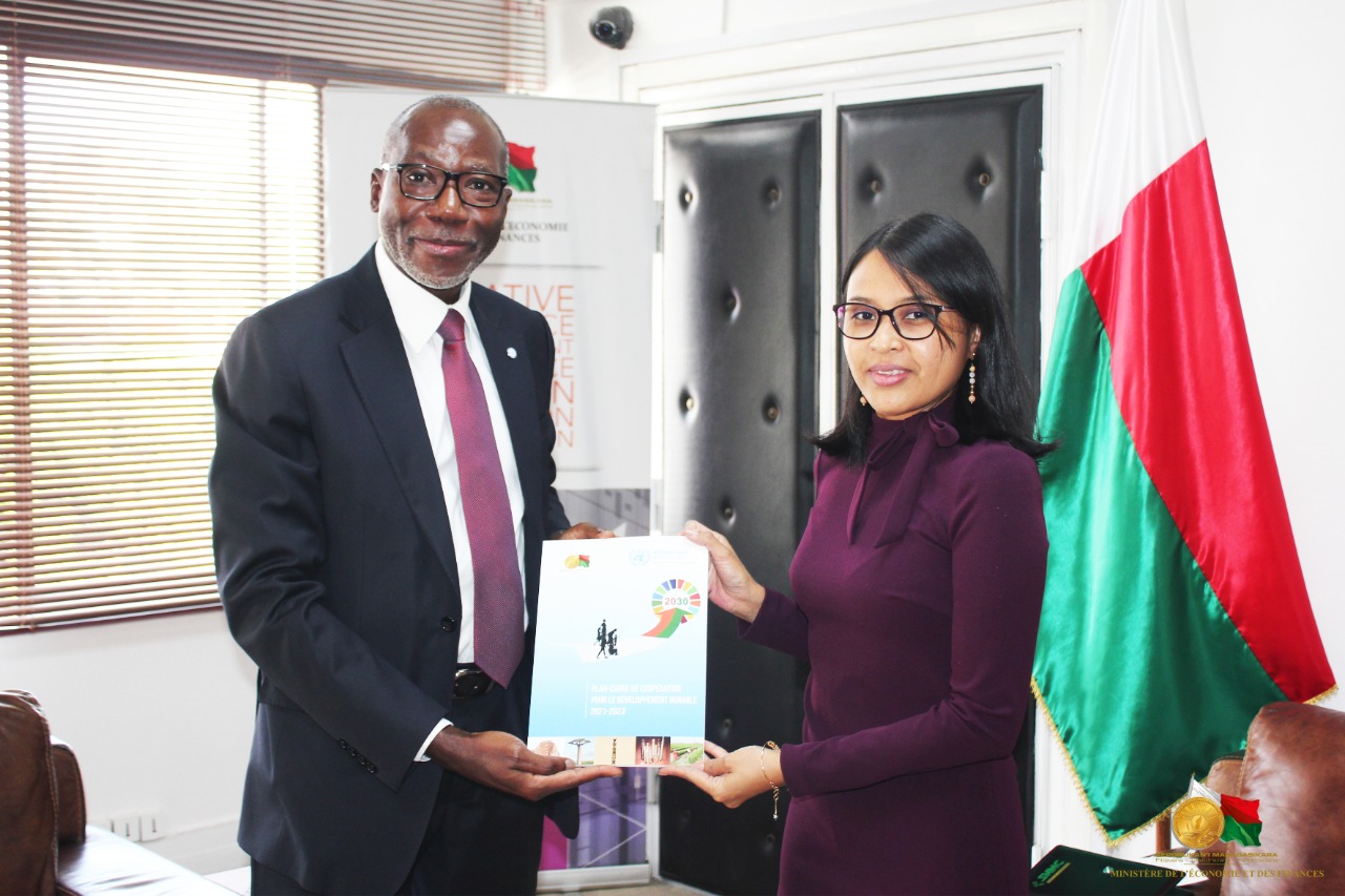 Visite de courtoisie de Monsieur Issa Sanogo auprès de Madame le Ministre de l’Economie et des Finances Antaninarenina, 2 novembre 2021. Madame Rindra Hasimbelo RABARINIRINARISON, Ministre de l’Economie et des Finances, a reçu ce mardi 02 novembre 2021, Monsieur Issa Sanogo, Coordonnateur Résident des Nations Unies à Madagascar. Durant cette rencontre, il a présenté à Madame le Ministre, le « Plan cadre de coopération pour le Développement Durable à Madagascar de 2021 à 2023 », document qui constitue l’appui commun et intégré du Système des Nations Unies à Madagascar à l’émergence du pays et à la réalisation des engagements du Président de la République pendant la période de Juillet 2021 à décembre 2023. Notons que l’élaboration de ce document a été conduite par l’actuelle Ministre de l’Economie et des Finances durant son mandat de Secrétaire général avec la Direction générale de l’Economie et de Plan et l’INSTAT.