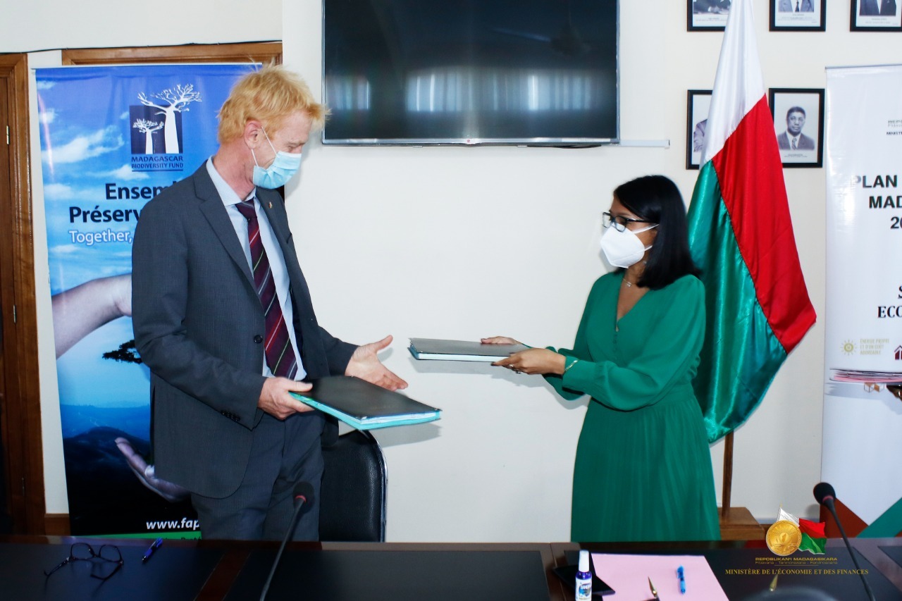 La cérémonie de signature s’est tenue dans la Salle de signature du Ministère de l’Économie et des Finances, en présence de Madame Rindra Hasimbelo Rabarinirinarison, Ministre de l’Économie et des Finances, Monsieur Martin Bostroem, Chef de projet KfW et Madame Anitry ny Aina Ratsifandrihamanana, Présidente du Conseil d’Administration de la FAPBM. Madame La Ministre a souligné que « Les défis sont immenses, mais ensemble nous y arriverons. En effet, nous devons faire face à deux importantes menaces. La première s’agit des actes humains et la seconde du changement climatique. Il faut agir aujourd’hui, pas demain ni attendre 2030. » Ces préoccupations ont interpellé la KfW, « La KfW considère la Fondation pour les Aires Protégées et la Biodiversité de Madagascar (FAPBM), ainsi que Madagascar National Parks (MNP) comme pilier de la protection de l’environnement et de la biodiversité à Madagascar. Les riverains des zones protégées bénéficient de la protection des habitats et de leur potentiel économique, de réglementations claires en matière d’utilisation ainsi que du développement touristique », a expliqué le chef de projet de KfW. La Présidente du Conseil d’Administration a salué ce geste de solidarité en précisant que « Les aires protégées sont les derniers sanctuaires de la biodiversité unique de notre pays. Elles contribuent de manière significative à l’économie nationale et à notre bien-être quotidien. Mais elles subissent de nombreuses pressions, qui sont aggravées par la pandémie et ses impacts sur le secteur du tourisme ainsi que par les effets du changement climatique. Nous remercions la coopération allemande de cet appui financier qui vient à point nommé pour renforcer les efforts menés par les gestionnaires d’aires protégées et les communautés locales. La FAPBM renouvelle son engagement à leur apporter soutien à travers nos mécanismes de financement. »